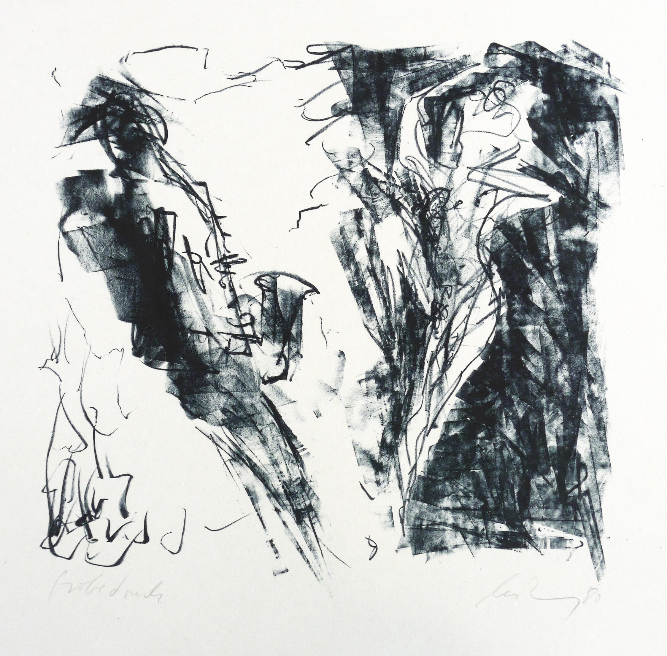1980. Lithografie / Kreidelithografie, in Blauschwarz, auf hellchamois Velin. – Originale Künstlergrafik, von Helge Leiberg. – Probedruck. – 29 x 31 cm (Blatt), 22,5 x 23,8 cm (Darstellung / Druckbild).