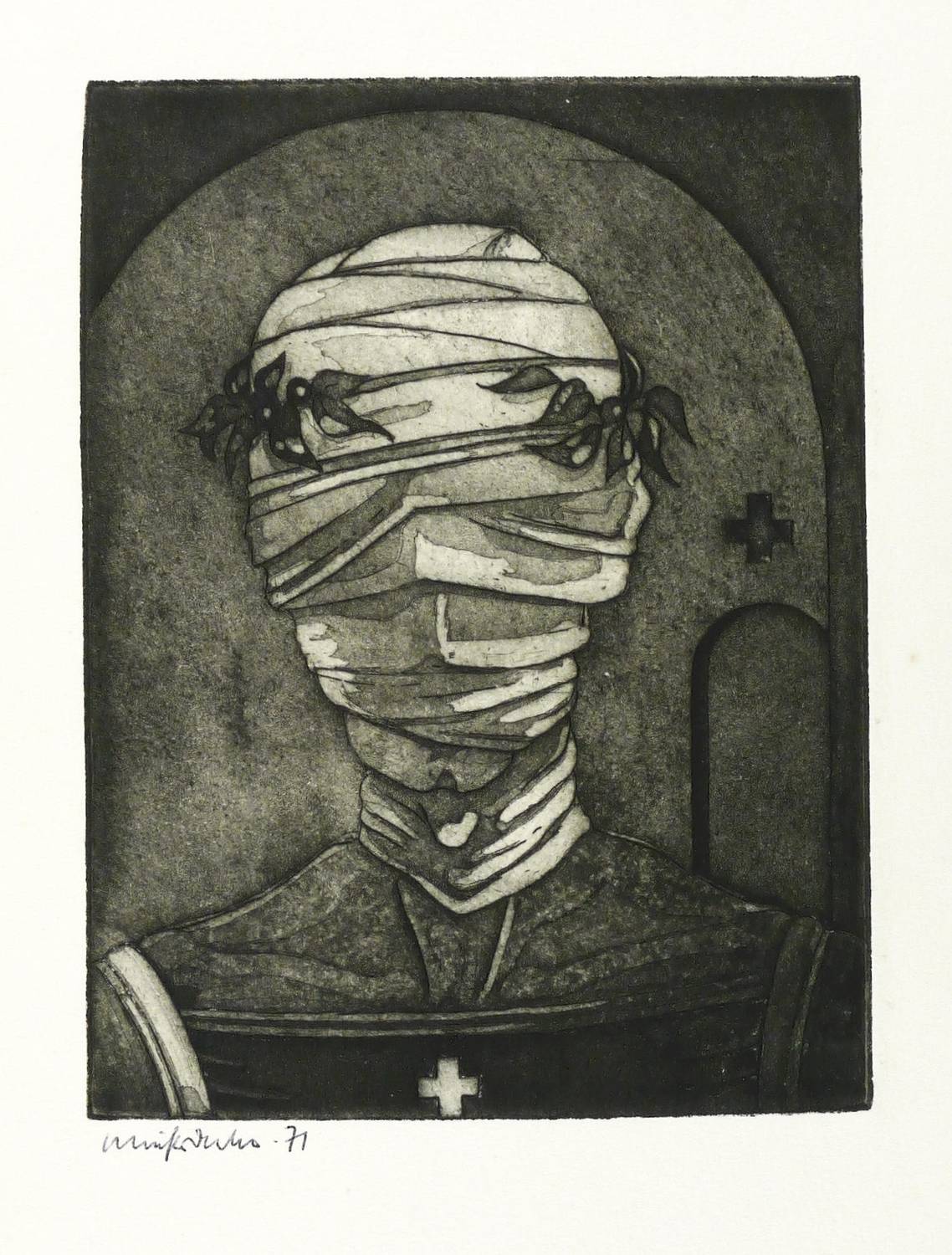 1971. Radierung / Aquatinta, in Schwarz, auf festem hellchamois Velinkarton. – Originale Künstlergrafik, von Jürgen Schieferdecker. – 31 x 21 cm (Blatt), 17,8 x 13,5 cm (Darstellung / Druckbild).