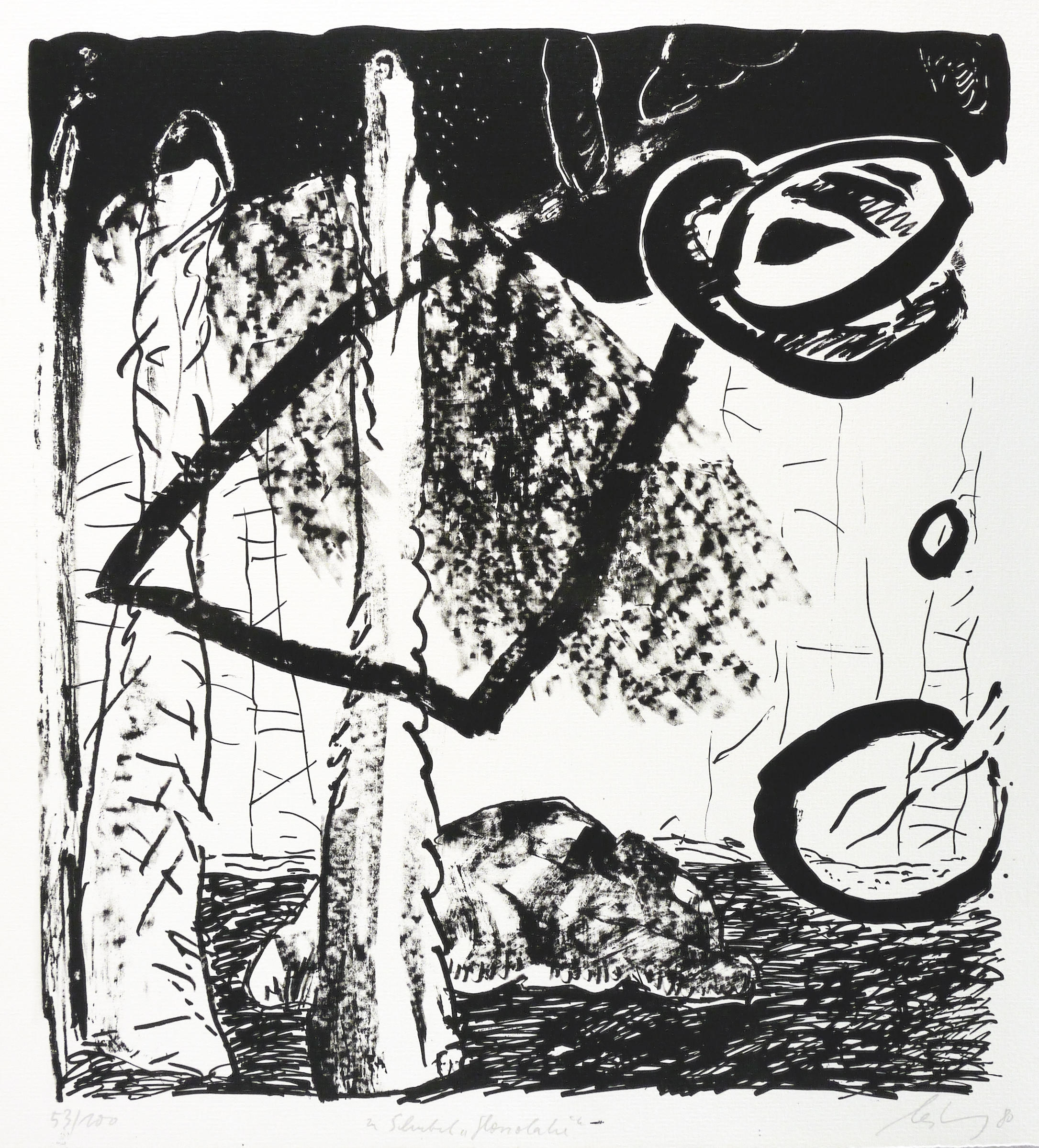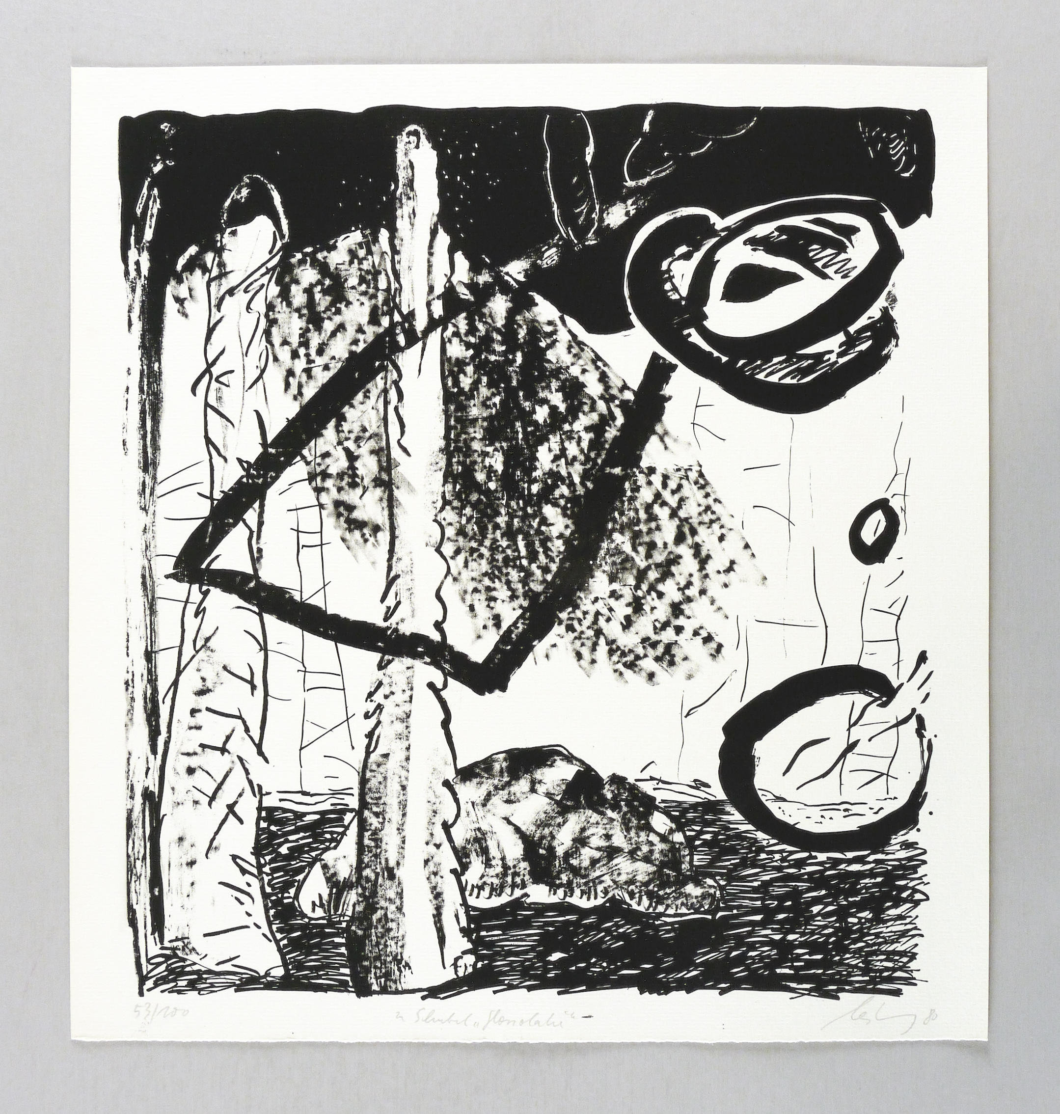 1980. Zinkografie / Kreide- & Pinselzinkografie, in Schwarz, auf hartem hellchamois Weißenborn. – Originale Künstlergrafik, von Helge Leiberg. – Auflage Exemplar Nr. 53/100. – 39 x 37 cm (Blatt), 35,6 x 32,1 cm (Darstellung / Druckbild).
