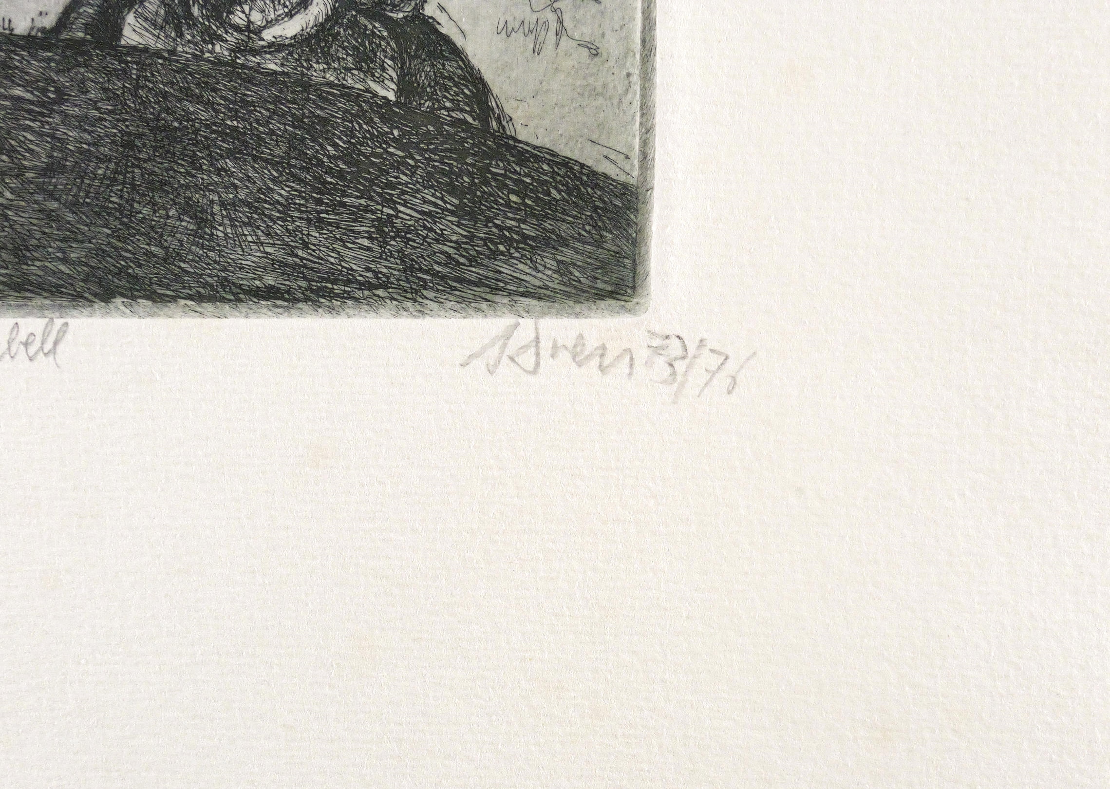 1973/1976. Radierung / Strichätzung & Schmirgel, in Schwarz, auf hartem hellchamois Weißenborn. – Originale Künstlergrafik, von Andreas Dress. – 11,3 x 9,7 cm (Darstellung / Druckbild), 37 x 24 cm (Blatt).