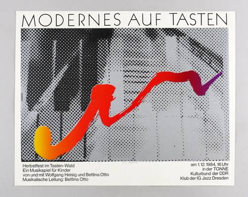 Nicht handsigniert. Unter der Darstellung mittig in Bleistift eigenhändige Widmung: ″für Micha″. In der Druckform links am Rand Signatur: ″HAUFE″. – Originalgrafisches Künstlerplakat für das Konzert ″Modernes auf Tasten. Herbstfest im Tasten-Wald. Eine Musikspiel für Kinder″ mit Wolfgang Heisig und Bettina Otto am 1.12.1984 in der Tonne, Kulturbund der DDR und Klub der IG Jazz Dresden. – Sehr guter Zustand.