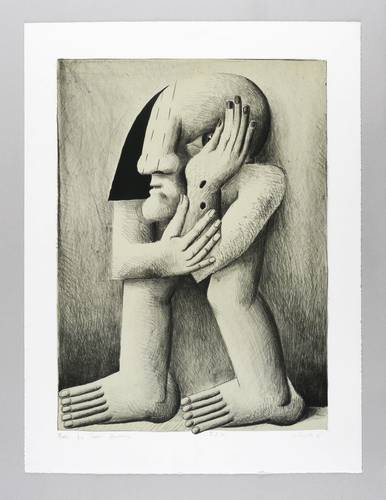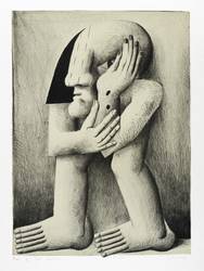 Horst Antes (*1936 Heppenheim - lebt und arbeitet in Karlsruhe, Berlin und Castellina in Chianti / Italien). Deutscher Maler, Grafiker und Bildhauer. Studierte Malerei 1957-59 bei HAP Grieshaber an der Akademie der Bildenden Künste Karlsruhe. Seit 1967 Professor für Malerei an der Akademie Karlsruhe. 1962 Villa Romana Florenz, 1963 Villa Massimo Rom. 1963 Ausstellung der ersten plastischen Kopffüßler-Figur. 1967 Metallplastiken zum Garten der sieben Denkmäler der Lüste anlässlich der Bundesgartenschau für den Botanischen Garten in Karlsruhe. 1968 Gastprofessur an der Hochschule für Bildende Künste Berlin. Seit 1983 Mitglied der Freien Akademie der Künste Hamburg. - Seine monolithisch wirkenden, oft gnomenhaft körperlosen Figuren weisen Ankläge von spätem Kubismus und Surrealismus auf.