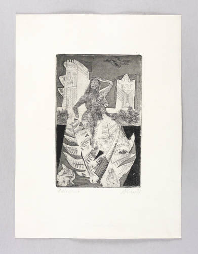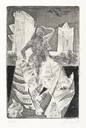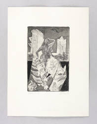 1977. Radierung / Strichätzung, Materialdruck & Aquatinta, in Schwarz, auf hartem hellchamois Weißenborn. – Originale Künstlergrafik, von Andreas Dress. – Probedruck. – 24,0 x 15,7 cm (Darstellung / Platte), 41 x 30 cm (Blatt).