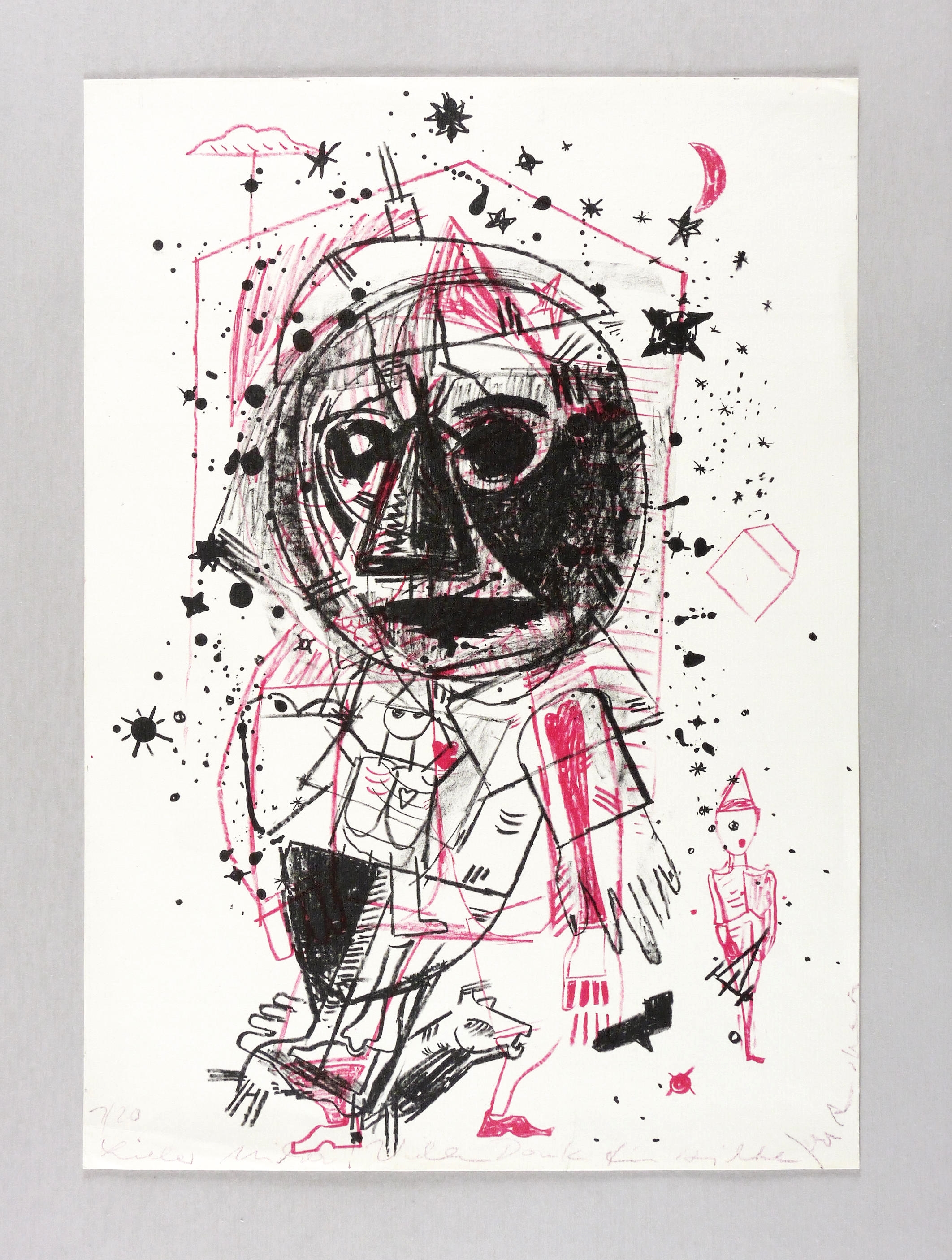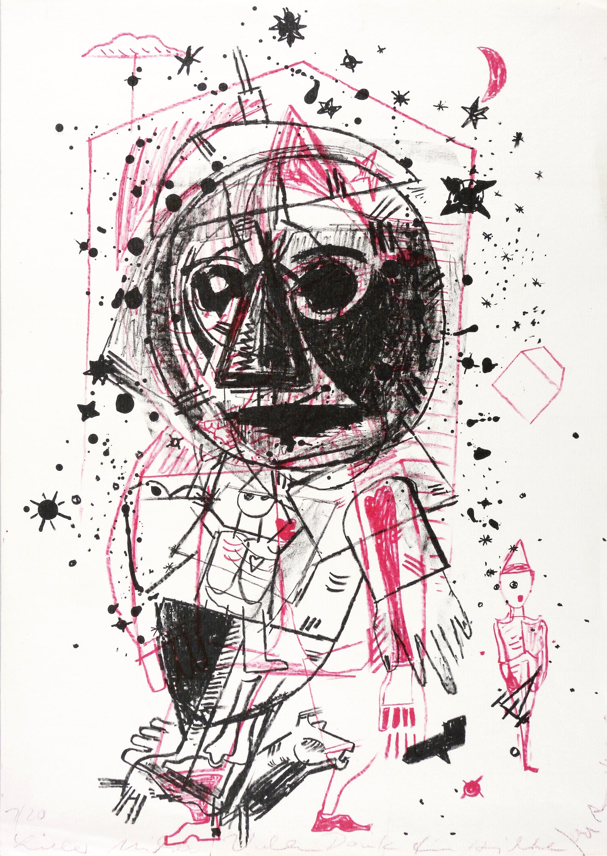 1980-1990. Farblithografie / Kreide- & Pinsellithografie, in Rot & Schwarz, auf hellchamois Maschinenbütten. – Originale Künstlergrafik, von Andreas Küchler. – Auflage Exemplar Nr. 1/20. – 42,0 x 29,8 cm (Darstellung / Blatt).