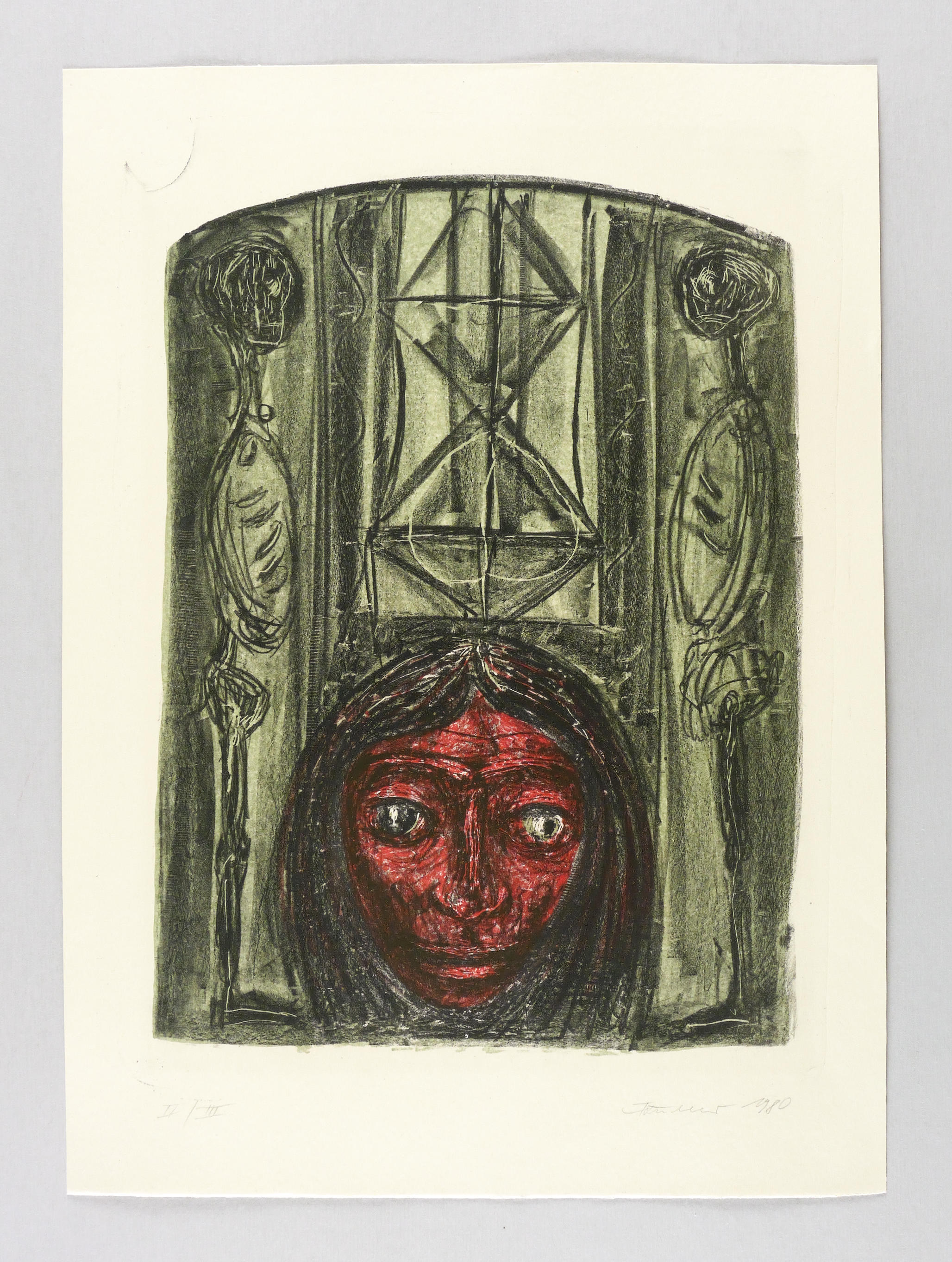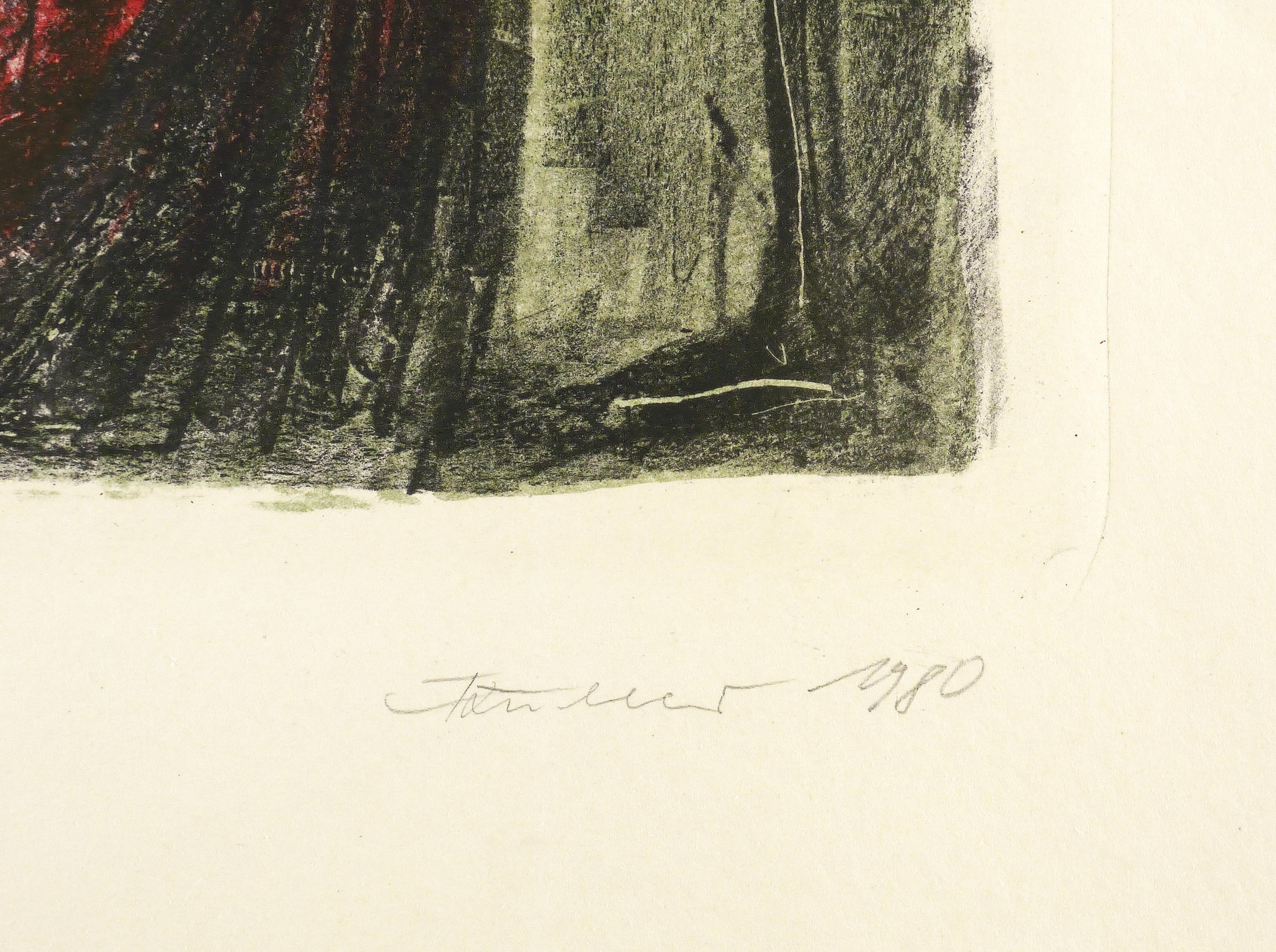 1980. Farblithografie / Kreide- & Pinsellithografie, partiell geschabt, in Rot & Schwarzgrün, auf festem chamois Velin. – Originale Künstlergrafik, von Andreas Küchler. – Auflage Exemplar Nr. II/III. – 39,0 x 28,7 cm (Darstellung / Druckbild), 51 x 37 cm (Blatt).