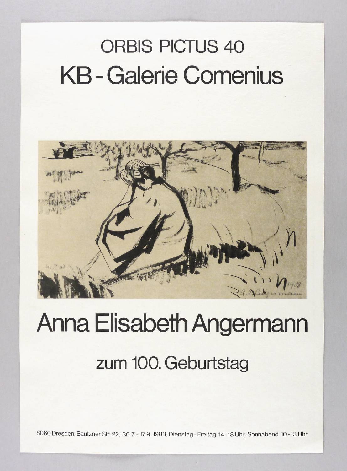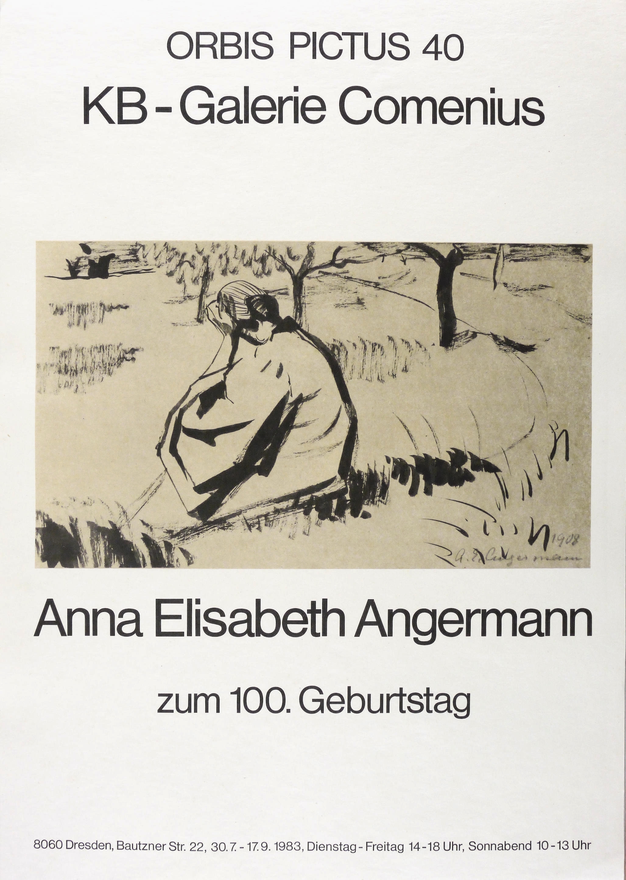 Nicht handsigniert. In der Druckform rechts unten Signatur und Jahr: ″A.E. Angermann 1908″. – Plakat zur Ausstellung ″Anna Elisabeth Angermann zum 100. Geburtstag″ 30.7.-17.9.1983 in der Galerie Comenius in Dresden (Reihe Orbis Pictus 40). – Sehr guter Zustand.