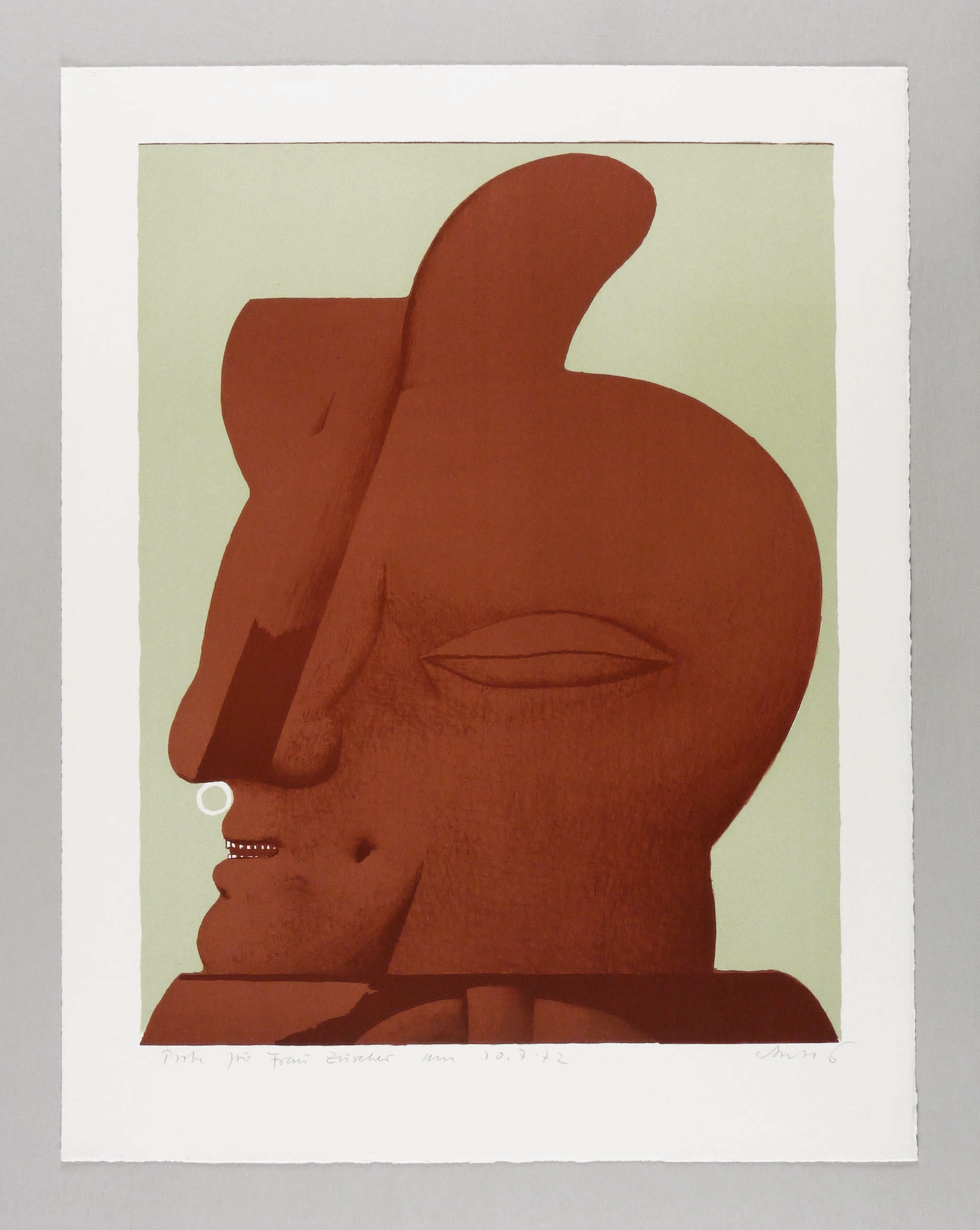 Horst Antes (*1936 Heppenheim - lebt und arbeitet in Karlsruhe, Berlin und Castellina in Chianti / Italien). Deutscher Maler, Grafiker und Bildhauer. Studierte Malerei 1957-59 bei HAP Grieshaber an der Akademie der Bildenden Künste Karlsruhe. Seit 1967 Professor für Malerei an der Akademie Karlsruhe. 1962 Villa Romana Florenz, 1963 Villa Massimo Rom. 1963 Ausstellung der ersten plastischen Kopffüßler-Figur. 1967 Metallplastiken zum Garten der sieben Denkmäler der Lüste anlässlich der Bundesgartenschau für den Botanischen Garten in Karlsruhe. 1968 Gastprofessur an der Hochschule für Bildende Künste Berlin. Seit 1983 Mitglied der Freien Akademie der Künste Hamburg. - Seine monolithisch wirkenden, oft gnomenhaft körperlosen Figuren weisen Ankläge von spätem Kubismus und Surrealismus auf.