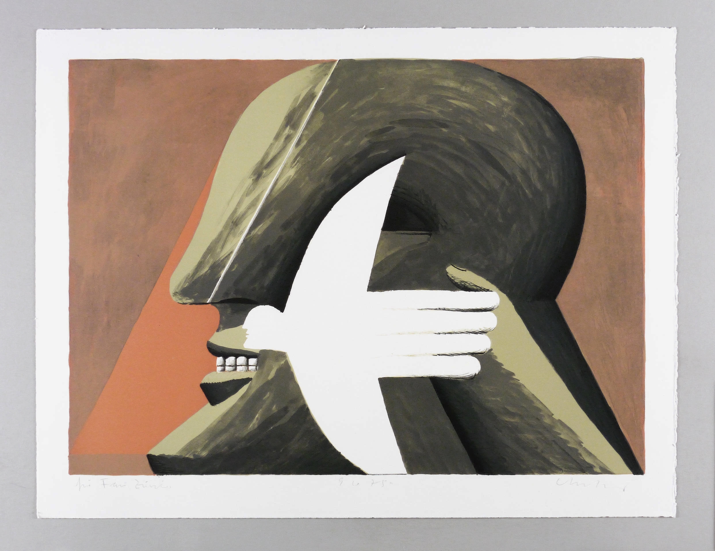 Horst Antes (*1936 Heppenheim - lebt und arbeitet in Karlsruhe, Berlin und Castellina in Chianti / Italien). Deutscher Maler, Grafiker und Bildhauer. Studierte Malerei 1957-59 bei HAP Grieshaber an der Akademie der Bildenden Künste Karlsruhe. Seit 1967 Professor für Malerei an der Akademie Karlsruhe. 1962 Villa Romana Florenz, 1963 Villa Massimo Rom. 1963 Ausstellung der ersten plastischen Kopffüßler-Figur. 1967 Metallplastiken zum Garten der sieben Denkmäler der Lüste anlässlich der Bundesgartenschau für den Botanischen Garten in Karlsruhe. 1968 Gastprofessur an der Hochschule für Bildende Künste Berlin. Seit 1983 Mitglied der Freien Akademie der Künste Hamburg. - Seine monolithisch wirkenden, oft gnomenhaft körperlosen Figuren weisen Ankläge von spätem Kubismus und Surrealismus auf.