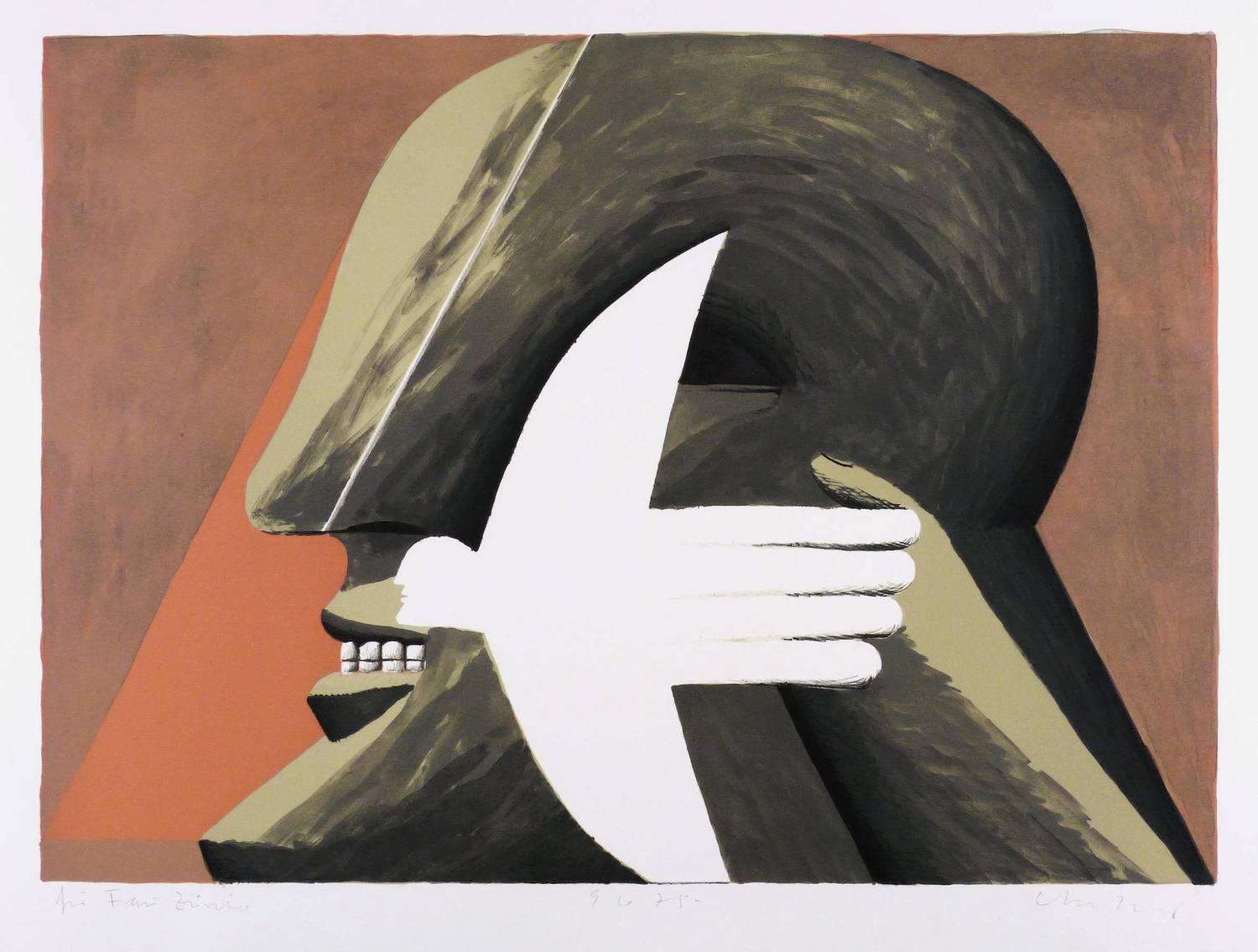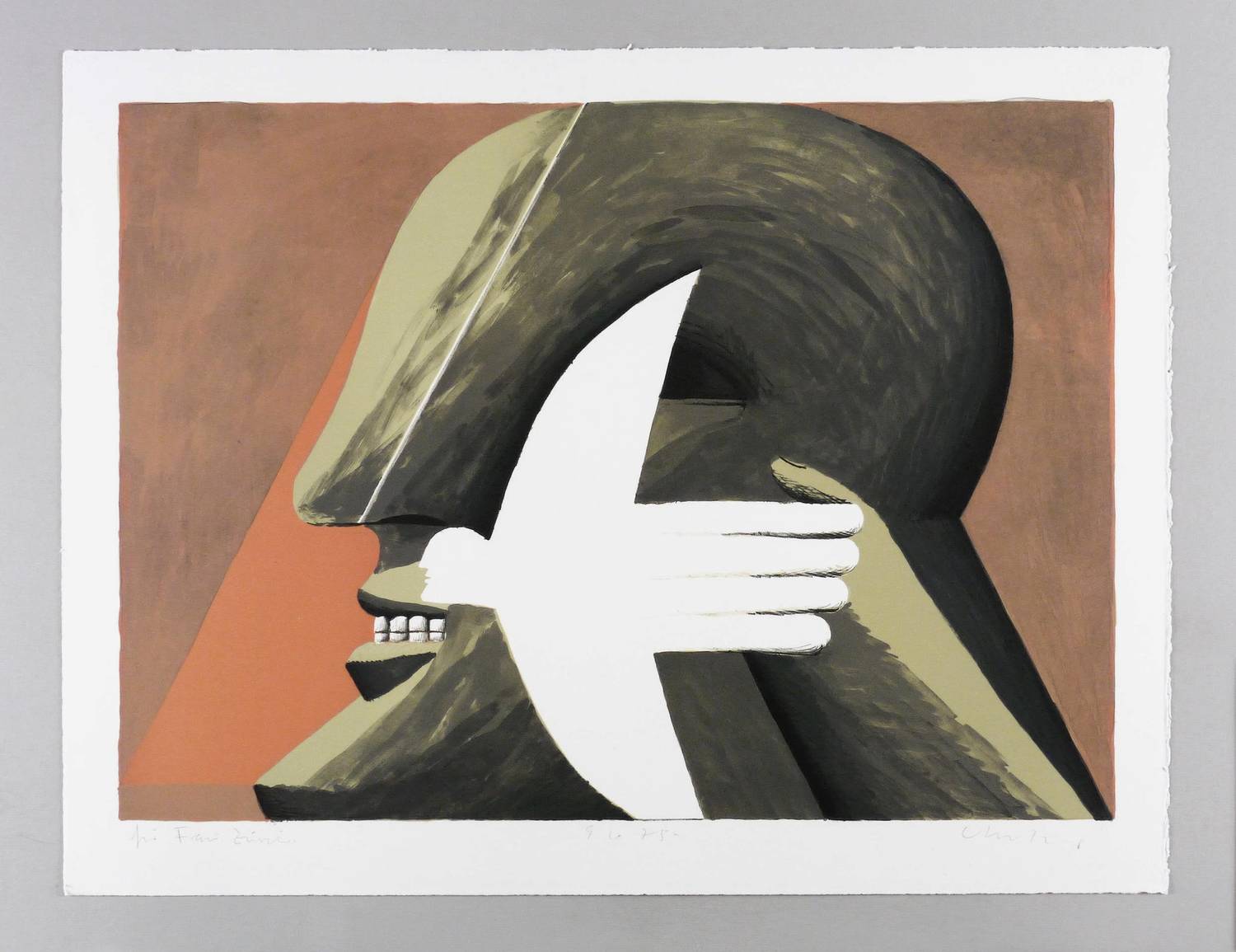 1975. Farblithografie / Kreide- & Pinsellithografie, in 6 Farben, auf rauem hellchamois BFK Rives. – Originale Künstlergrafik, von Horst Antes. – 47,5 x 65,5 cm (Darstellung / Druckbild), 56 x 73 cm (Blatt).
