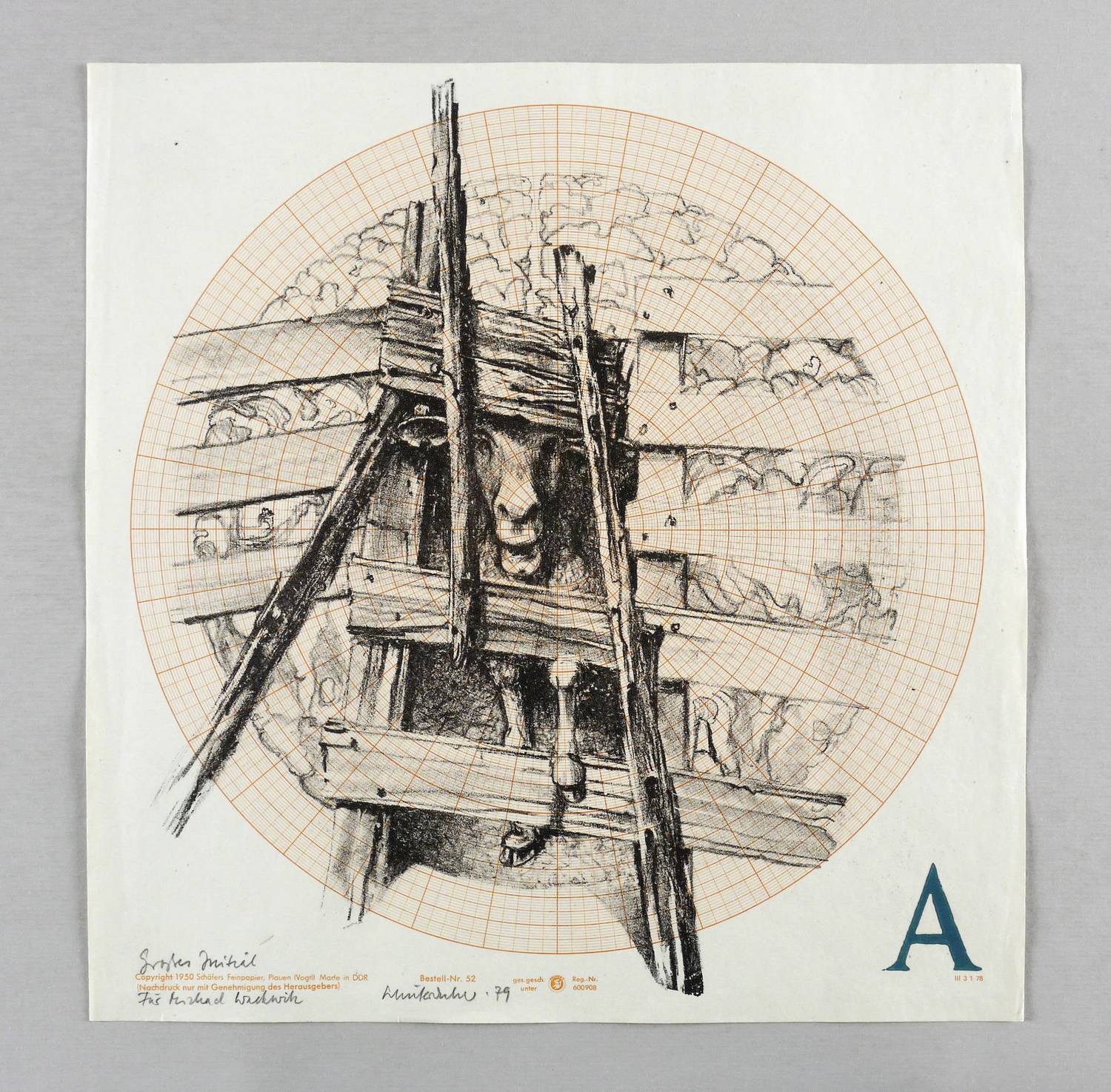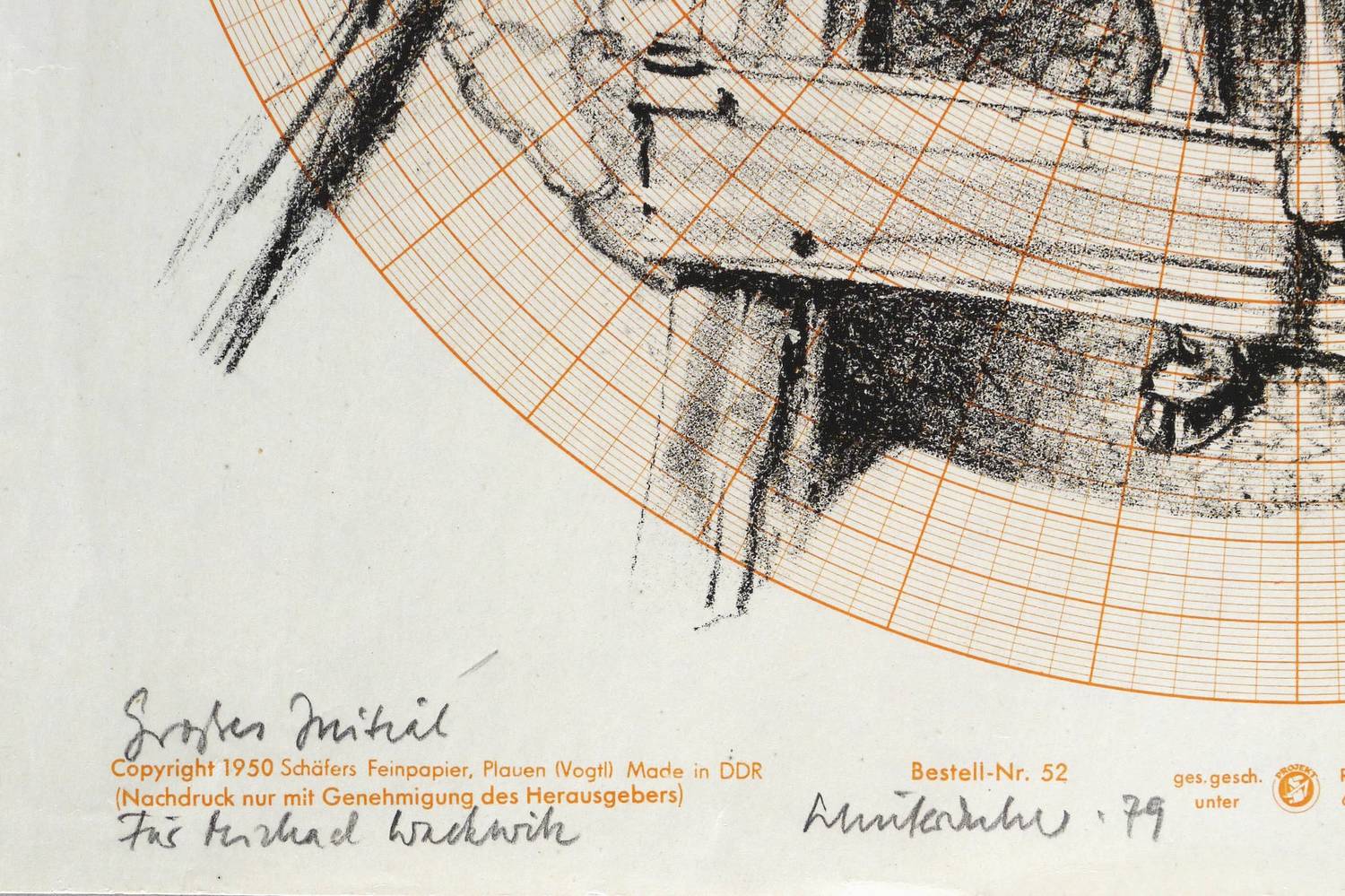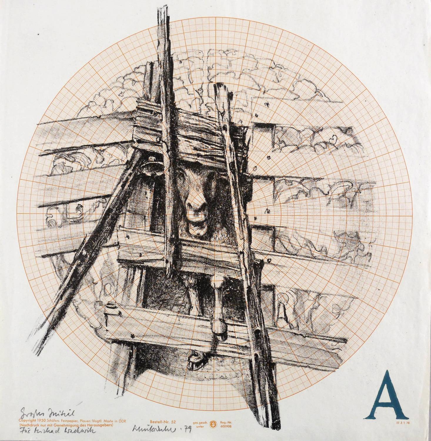 Schieferdecker-Haßler-Schobbert III 54. – Im unteren Blattrand in Bleistift signiert und datiert: ″Schieferdecker 79″. In der Blattecke links unten Titel und Widmung an den Steindrucker Michael Wackwitz. – Im Werkverzeichnis abweichend unter dem Titel ″Initial für eine Schule des Lebens″; dort auch mit der Jahresangabe 1979/1980. – Geringe Griffspuren von der Handhabung. Guter Zustand.