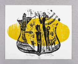 1978. Farbholzschnitt, in Gelb & Schwarz, auf rauem hellchamois Werkdruck. – Originale Künstlergrafik, von Günther Huniat. – Auflage Exemplar Nr. 32/120. – 14,9 x 19,7 cm (Darstellung / Druckstock), 18 x 21 cm (Blatt).