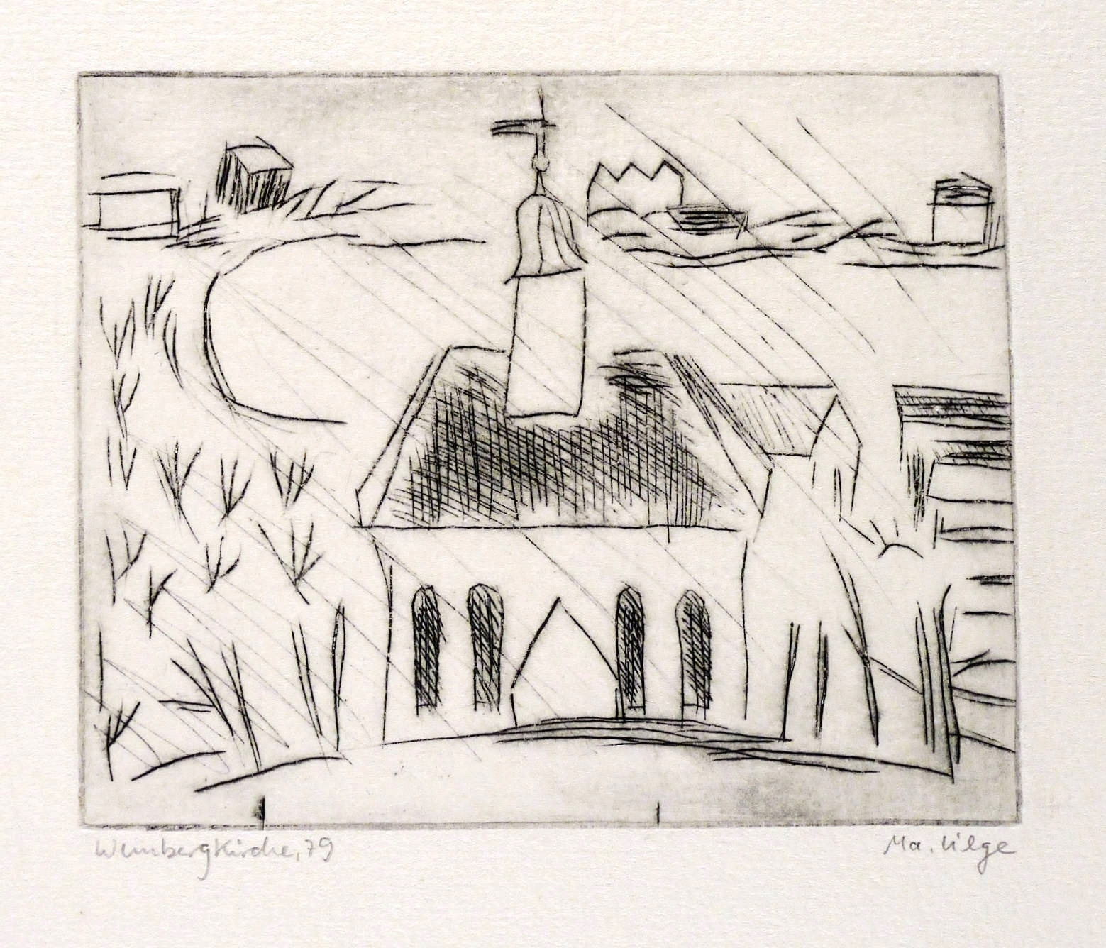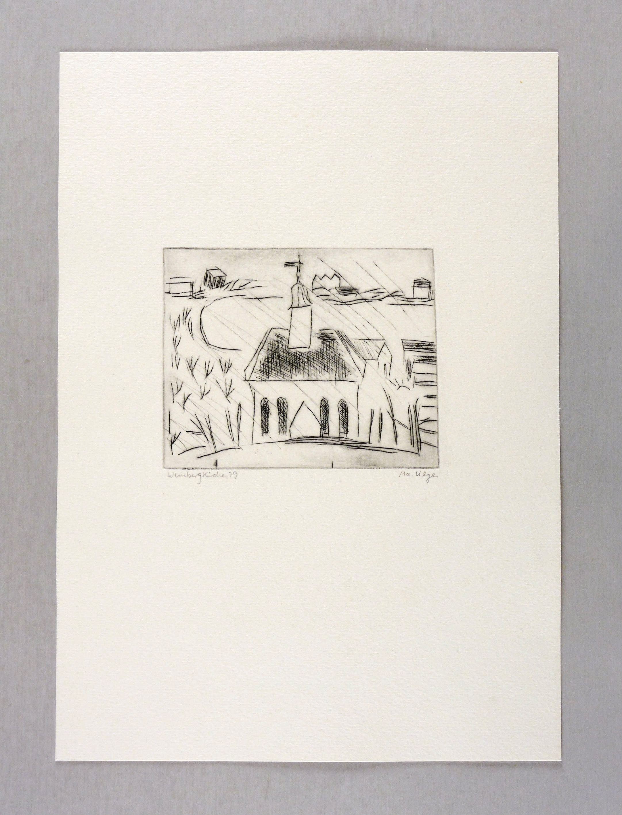 Rechts unten signiert: ″Ma. Lilge″. Links Titel und Jahr: ″Weinbergkirche 79″. – Sehr guter Zustand.