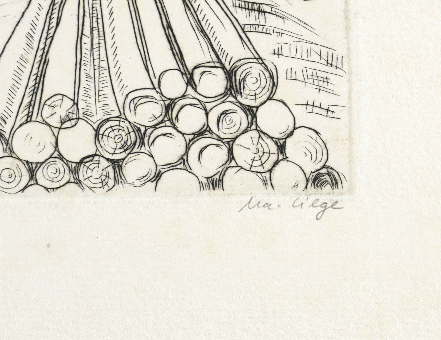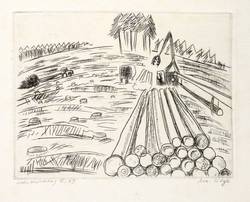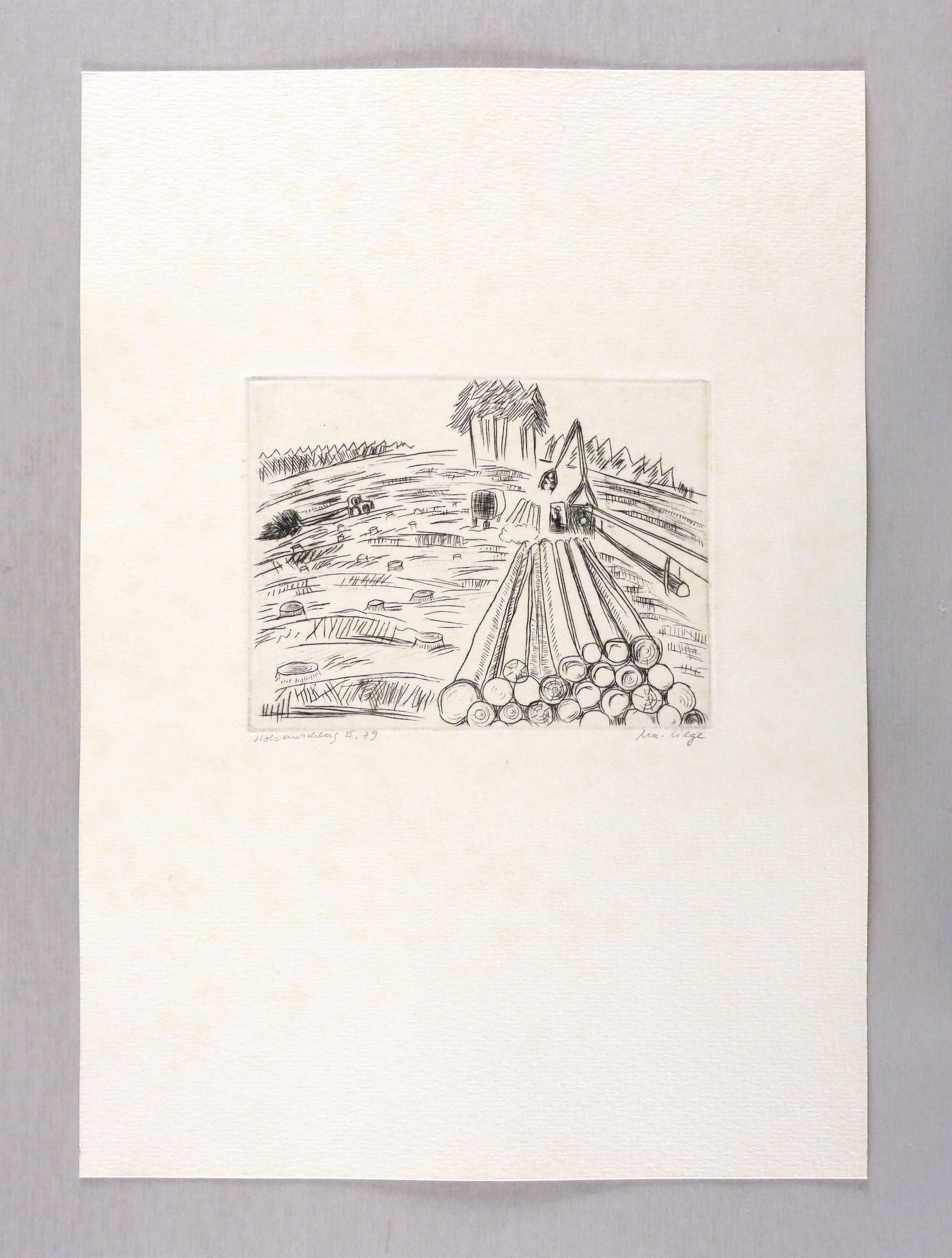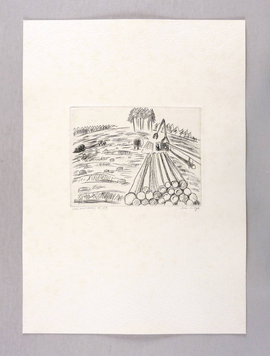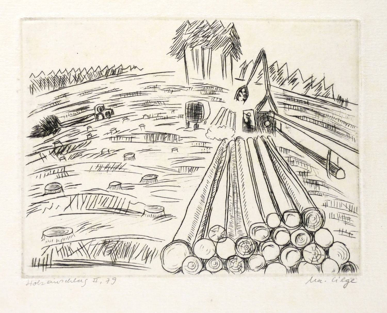 Rechts unten signiert: ″Ma. Lilge″. Links Titel und Jahr: ″Holzeinschlag II. 79″. – Papier schwach fleckig. Mäßig guter Zustand.