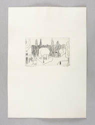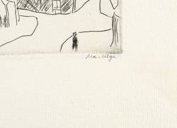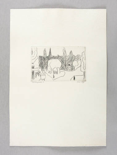 1978. Radierung / Strichätzung, in Schwarz, auf hellchamois Velinkarton. – Originale Künstlergrafik, von Marlis Lilge. – 9,5 x 13,5 cm (Darstellung / Platte), 33 x 23 cm (Blatt).