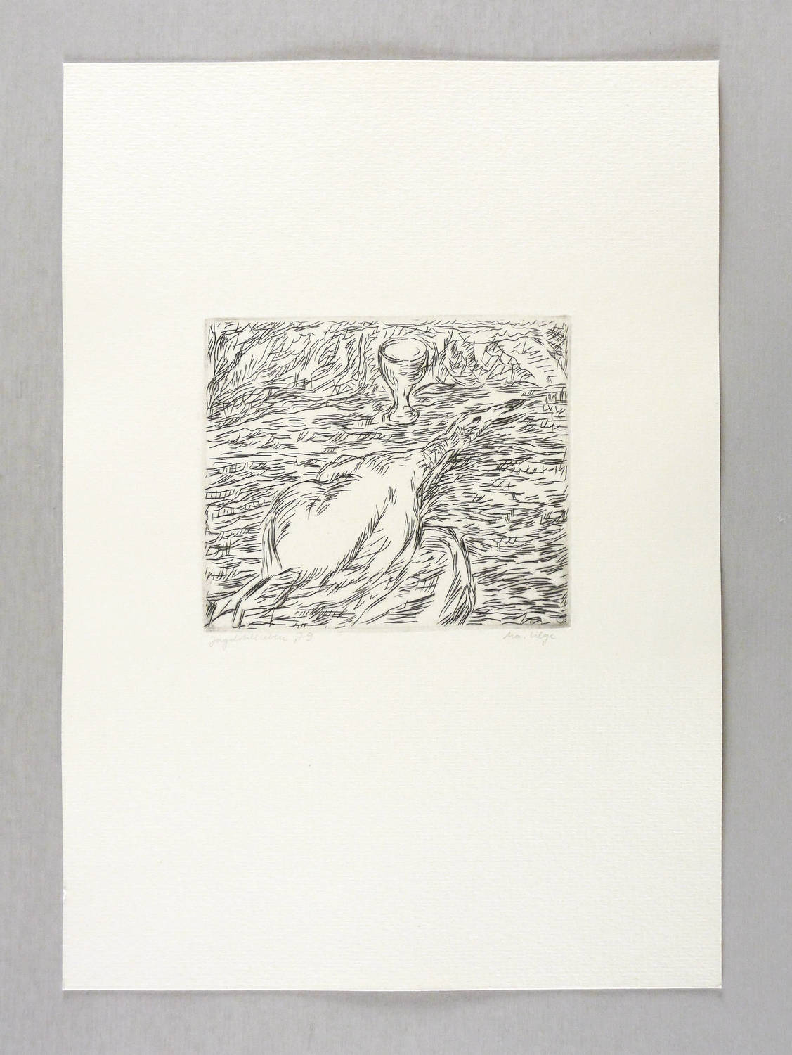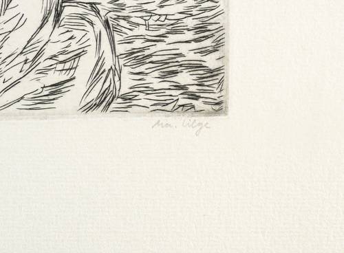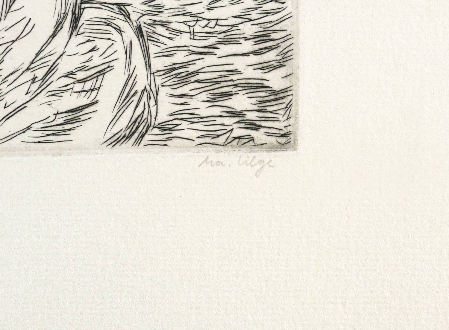 1979. Radierung / Strichätzung, in Schwarz, auf hellchamois Velinkarton. – Originale Künstlergrafik, von Marlis Lilge. – 11,0 x 13,0 cm (Darstellung / Platte), 33 x 23 cm (Blatt).