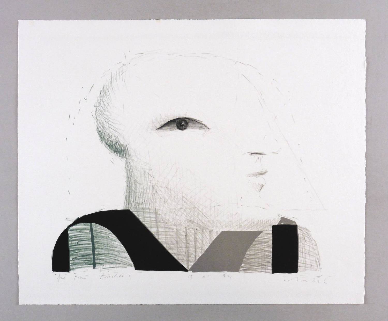 Lutze 749. – Rechts unten in Bleistift signiert: ″Antes″. Links Widmung: ″für Frau Zürcher″. Mittig Datum: ″13 XII 74″. Wasserzeichen von BFK Rives France. – Einzeldruck zu der Auflage von 120 nummerierten und signierten Exemplaren. – Druck bei Emil Matthieu in Dielsdorf (Schweiz) auf der Steindruckpresse Johannisberg 1911. – Sehr guter Zustand.
