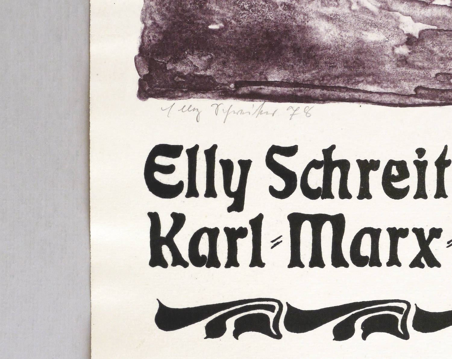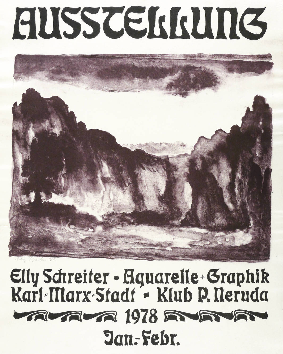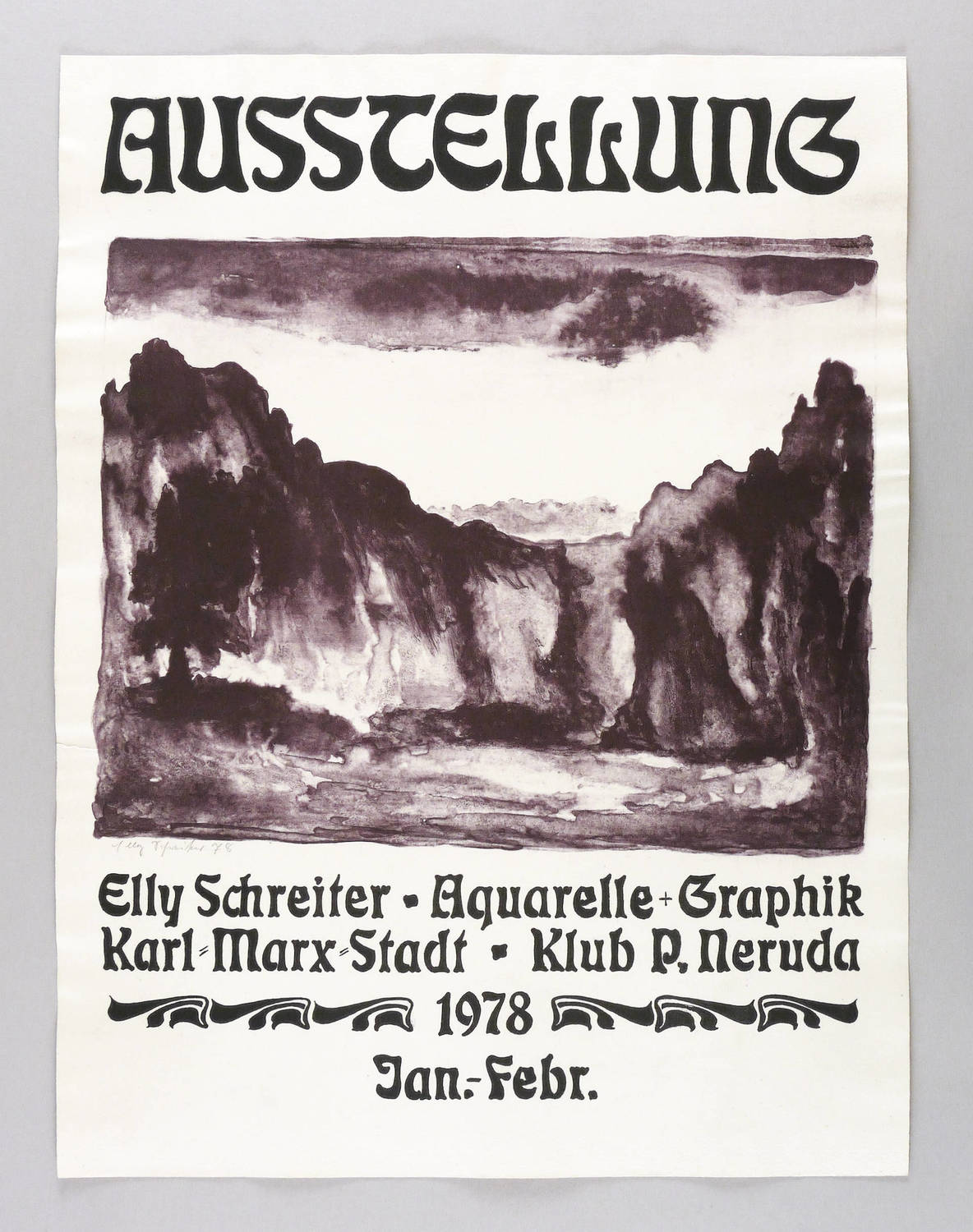 Links unter der Darstellung in Bleistift signiert und datiert: ″Elly Schreiter 78″. Im Stein diverse Inschriften. – Originalgrafisches Plakat zur Ausstellung ″Elly Schreiter. Aquarelle + Graphik″ 1978 im Klub Pablo Neruda in Karl-Marx-Stadt (Chemnitz). – Sehr guter Zustand.