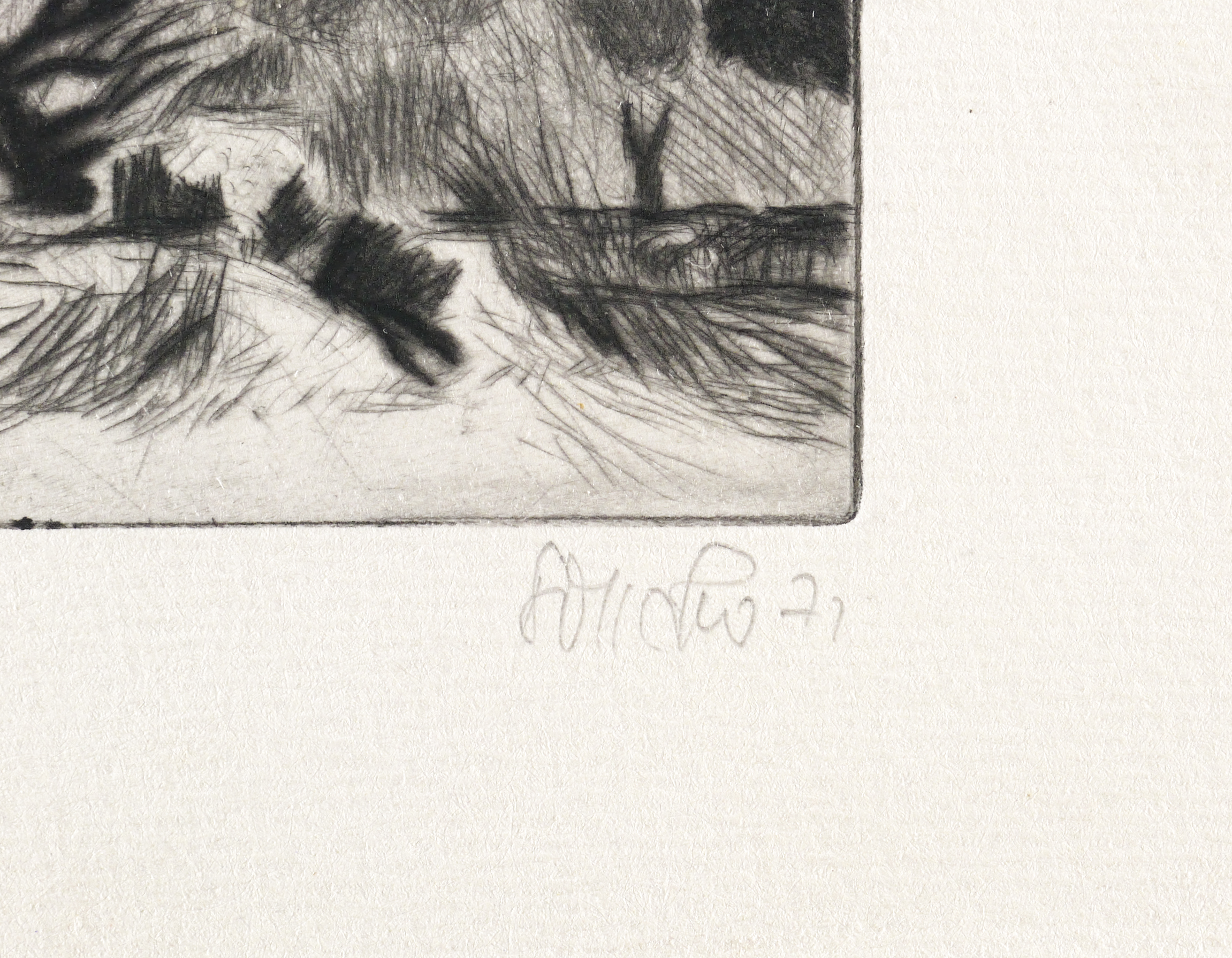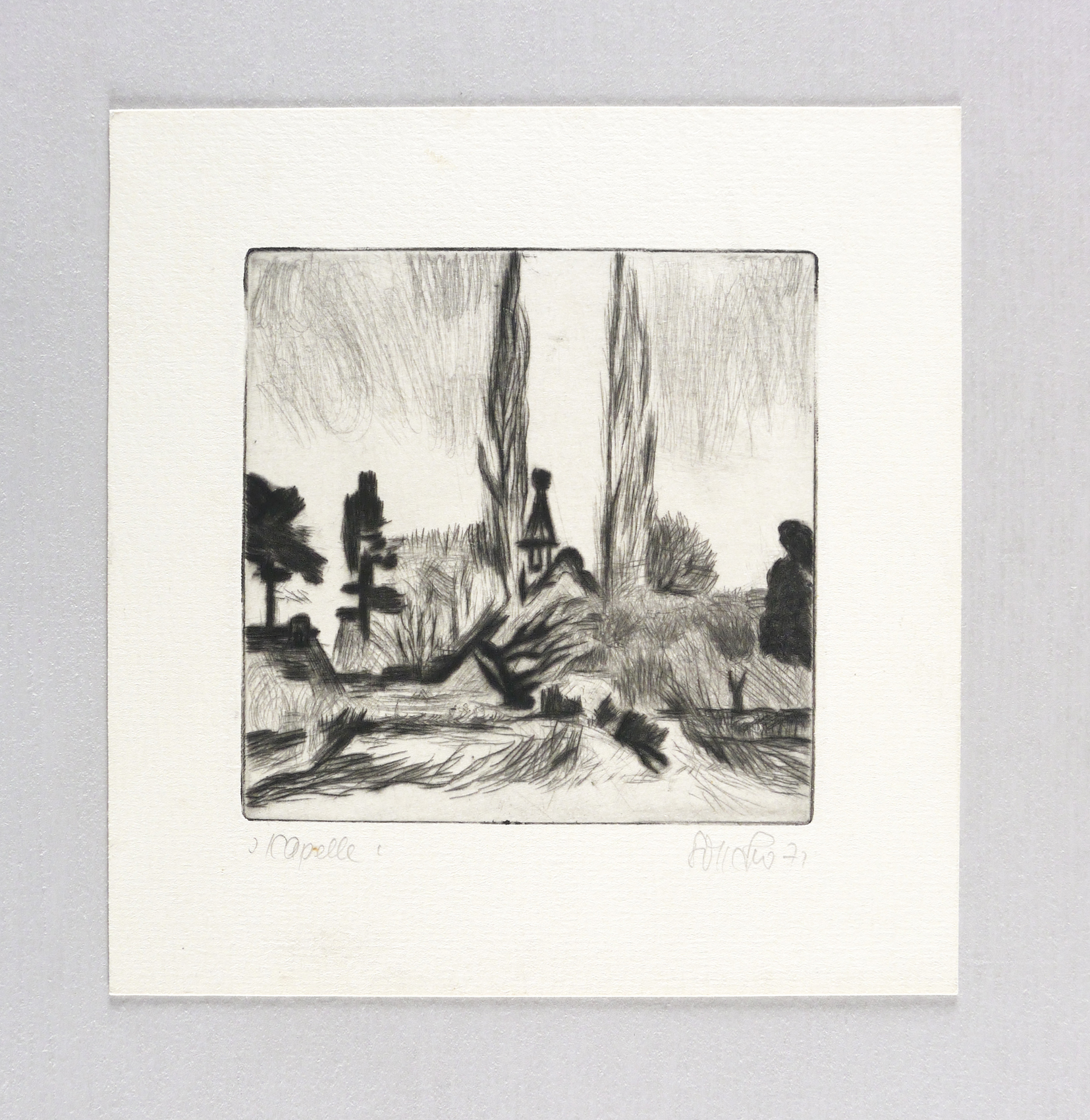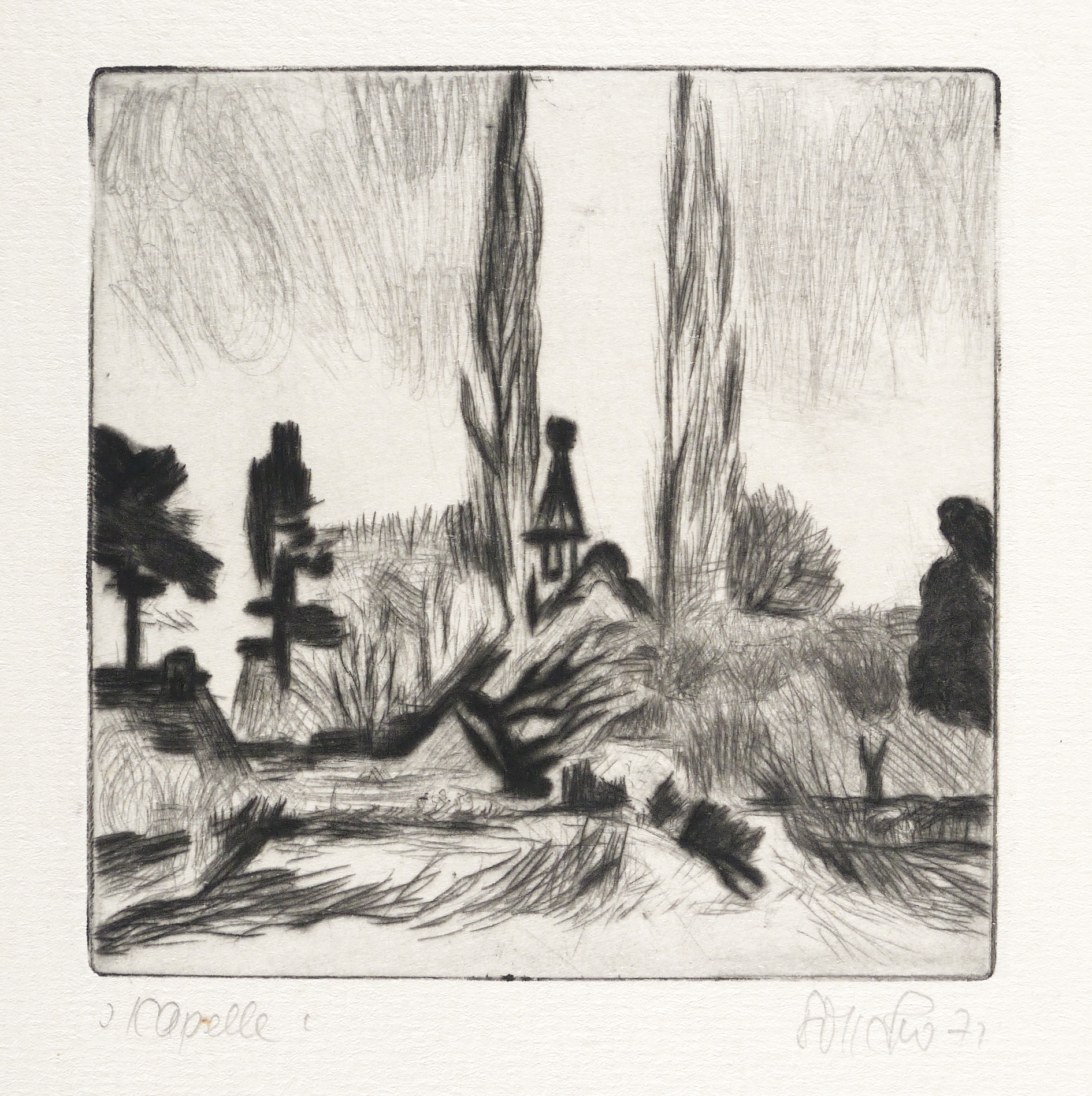 1971. Radierung / Kaltnadel, in Schwarz, auf hartem hellchamois Weißenborn. – Originale Künstlergrafik, von Manfred Richard Böttcher. – 9,9 x 9,8 cm (Darstellung / Platte), 16 x 15 cm (Blatt).