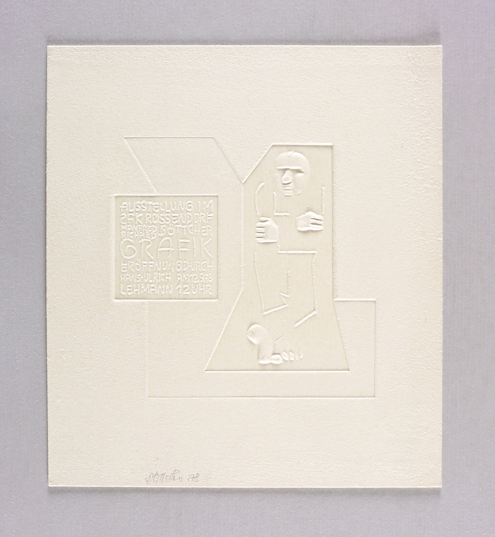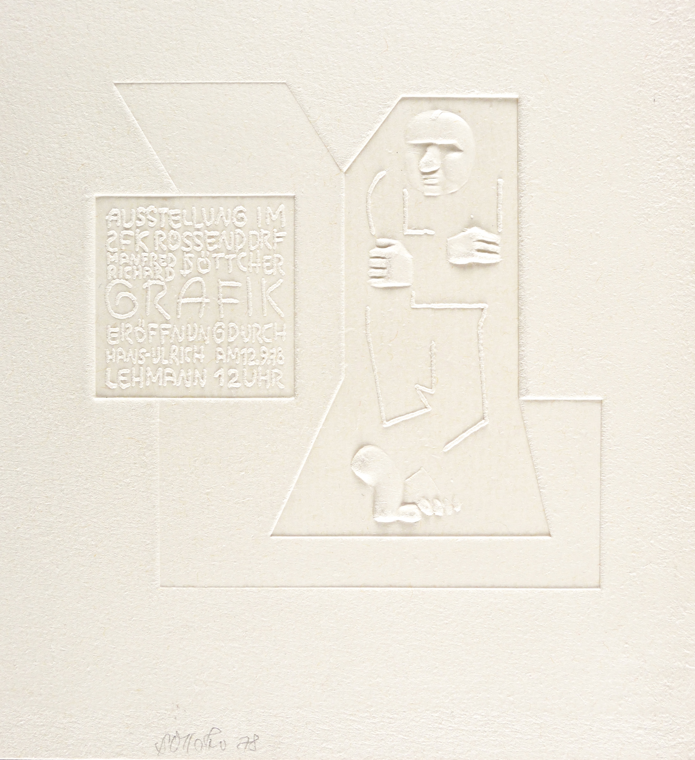 1978. Reliefdruck / Prägedruck, ohne Druckfarbe, auf festem hellchamois Hahnemühle. – Originale Künstlergrafik, von Manfred Richard Böttcher. – 11,4 x 11,5 cm (Darstellung / Platte), 20 x 18 cm (Blatt).