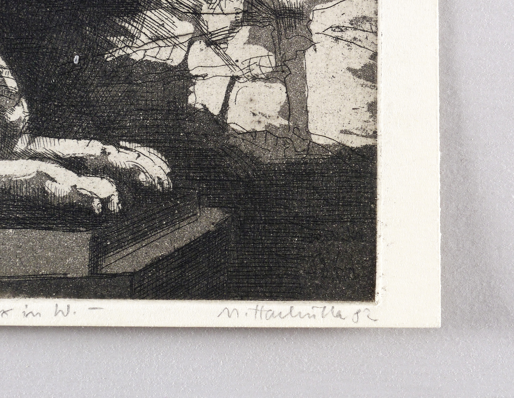 1982. Radierung / Strichätzung & Aquatinta, in Schwarz, auf hellchamois Velin. – Originale Künstlergrafik, von Ulrich Hachulla. – 14,8 x 16,6 cm (Darstellung / Platte), 16 x 19 cm (Blatt).
