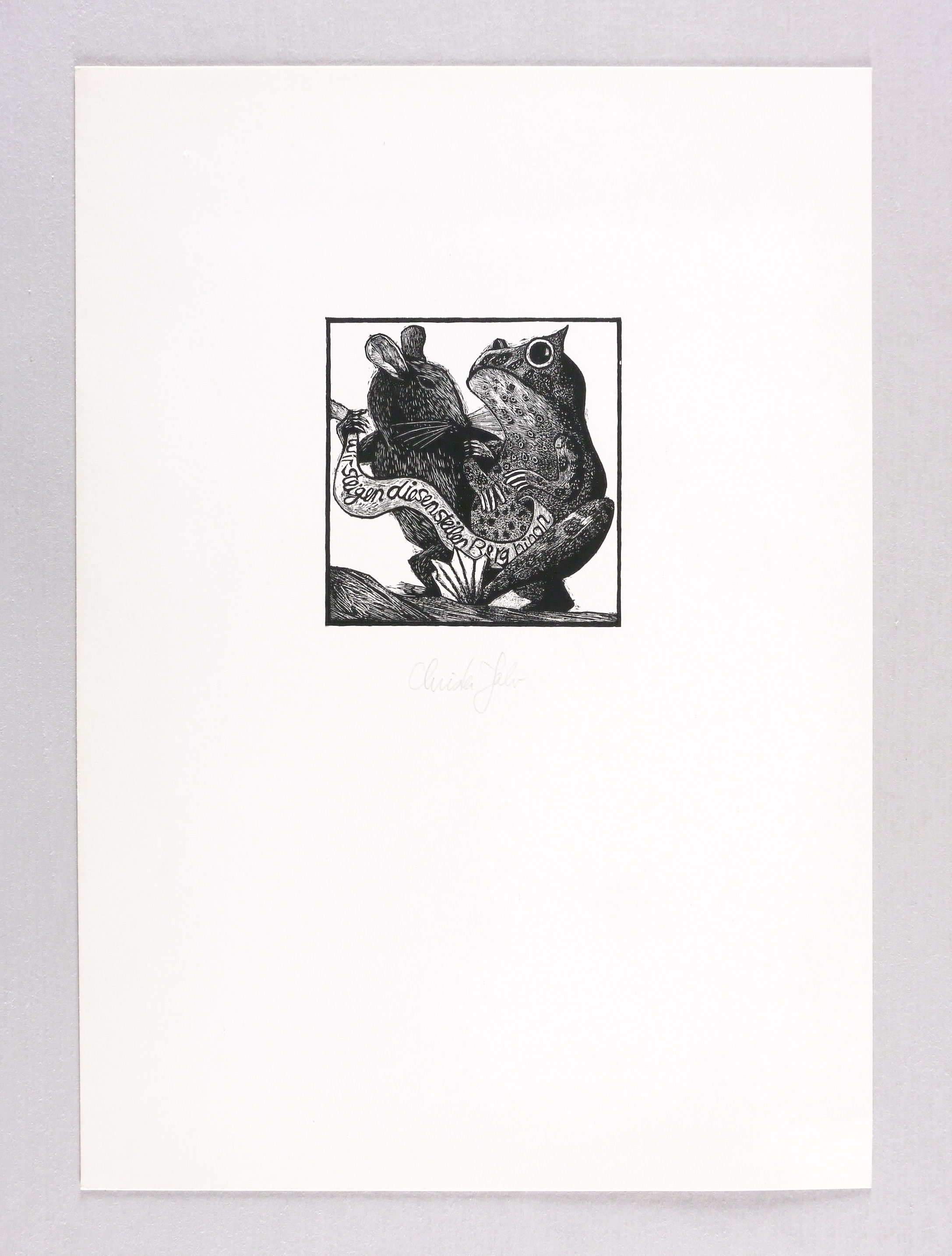 1970-1979. Holzschnitt, in Schwarz, auf glattem hellchamois Karton. – Originale Künstlergrafik, von Christa Jahr. – 8,2 x 7,8 cm (Darstellung / Druckbild), 30 x 21 cm (Blatt).
