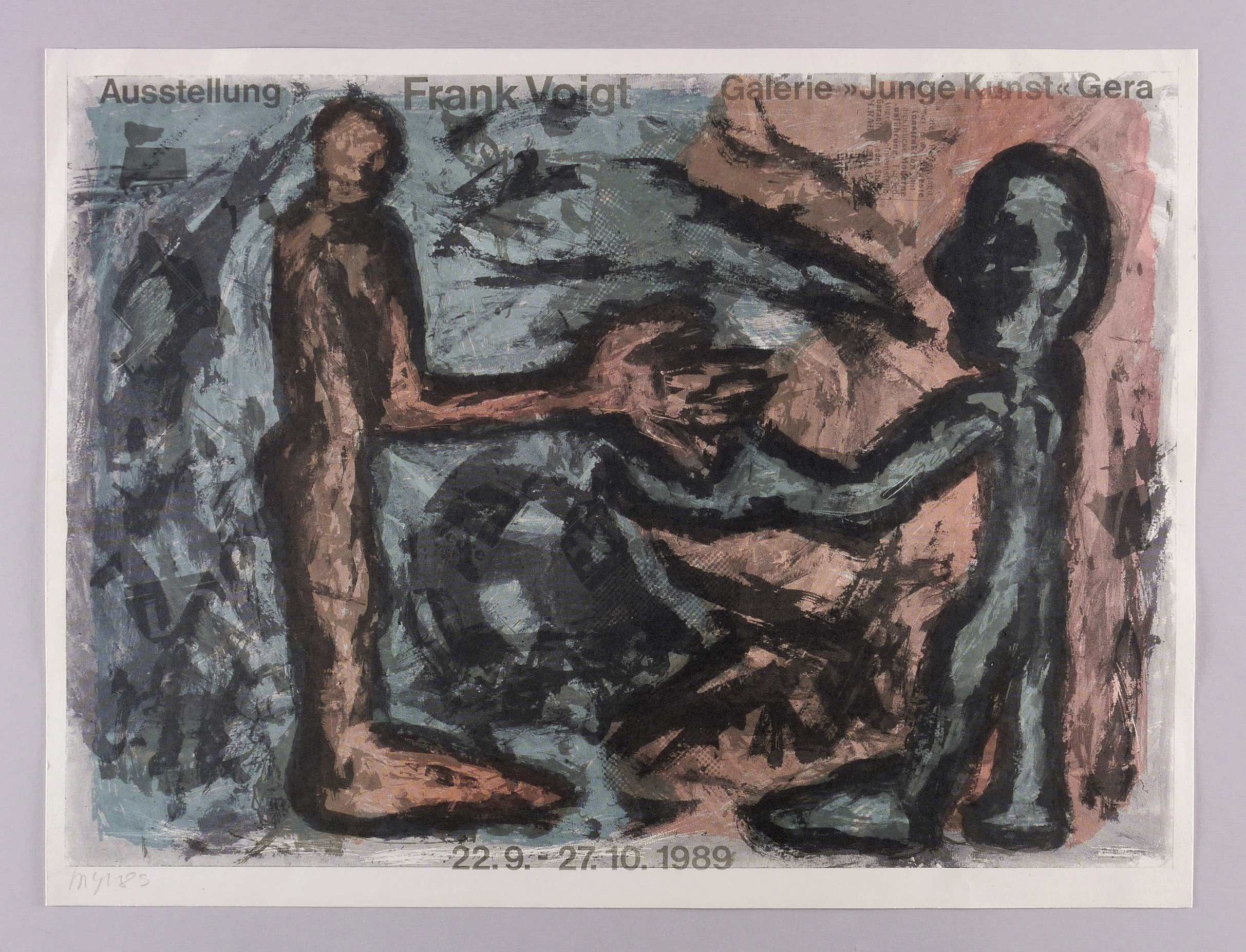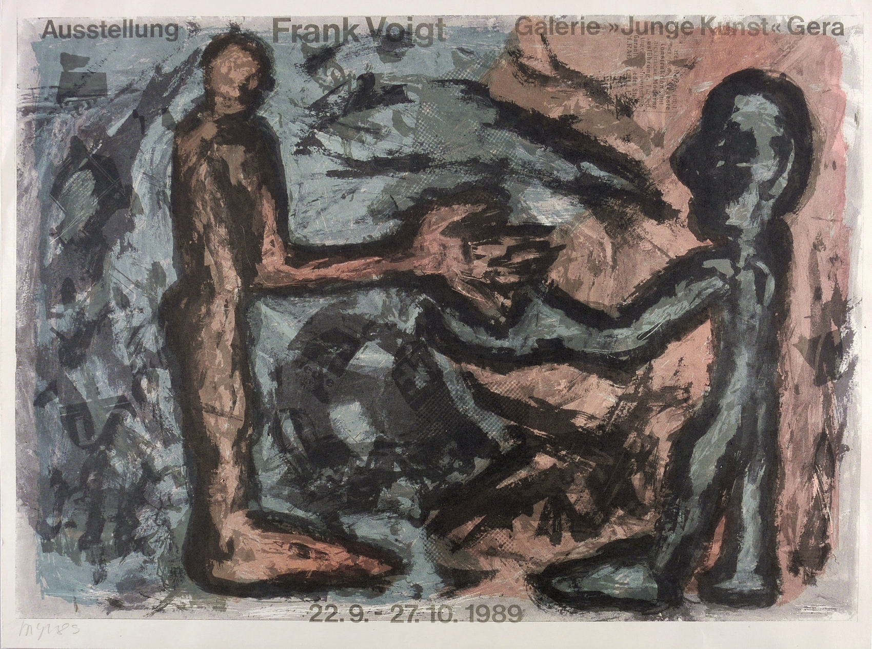 In Bleistift links unten signiert und datiert: ″Voigt 89″. – Originalgrafisches Künstlerplakat zur Ausstellung ″Frank Voigt″ 22.9.-27.10.1989 in der Galerie Junge Kunst in Gera. – Sehr guter Zustand.