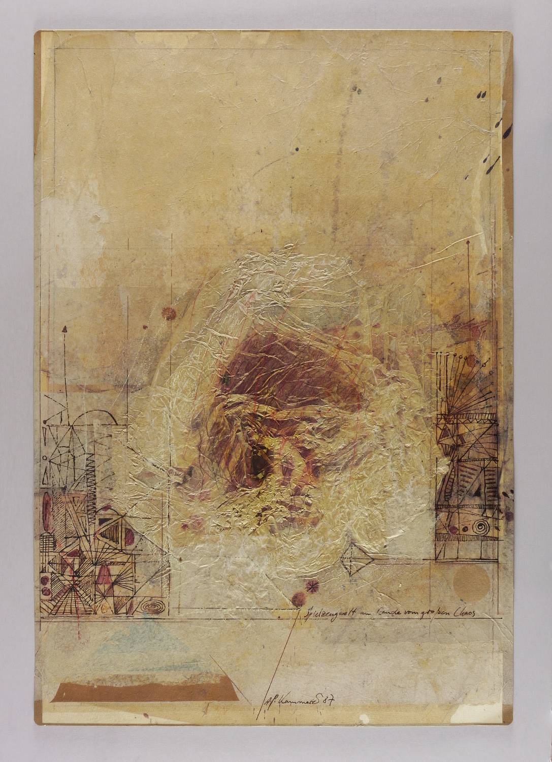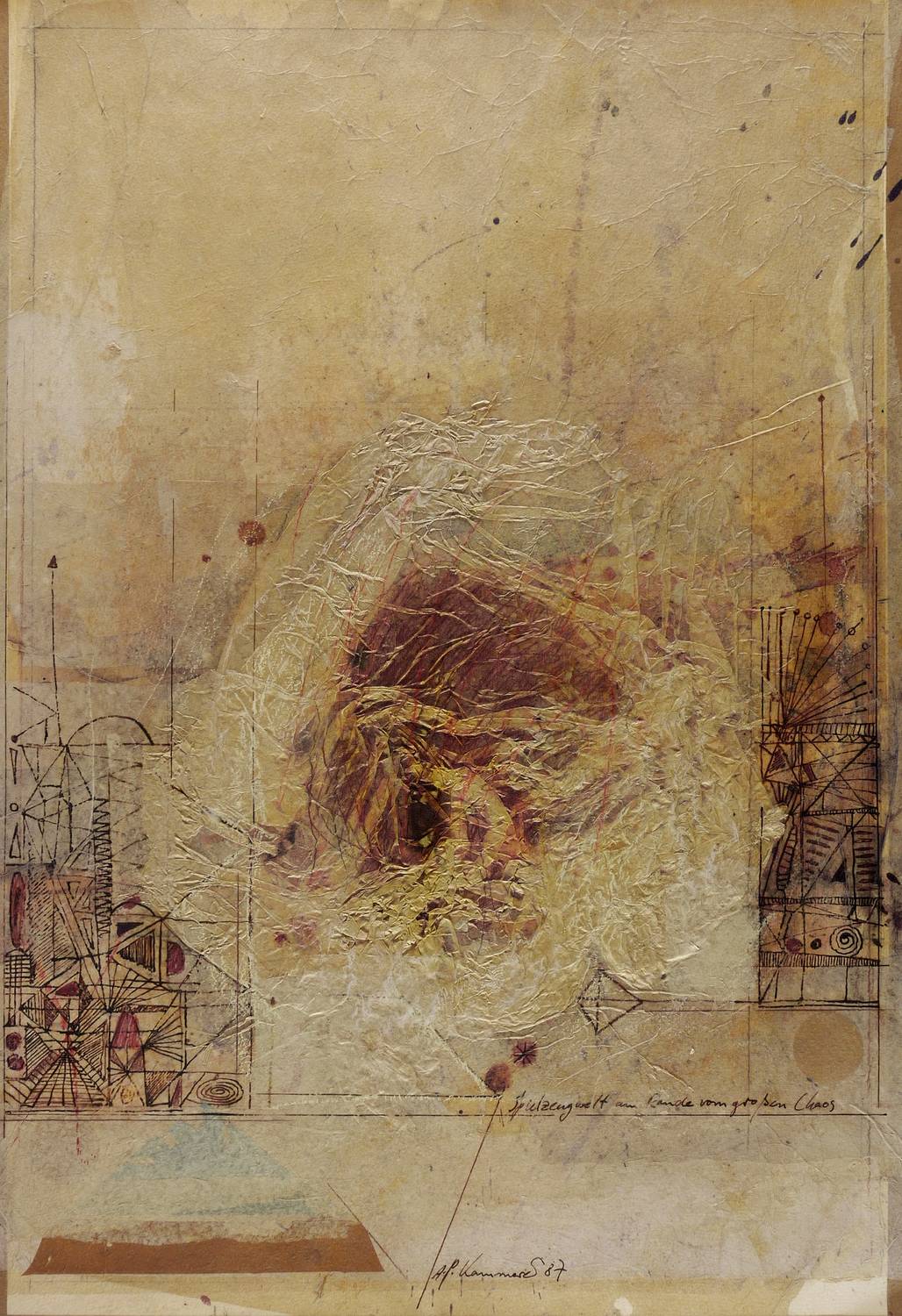 1987. Mischtechnik / Federzeichnung & Papiercollage, auf schwerem hellchamois Velinkarton. – Originale Künstlergrafik, von Anton Paul Kammerer. – Unikat. – 75,8 x 52,4 cm (Darstellung / Blatt).