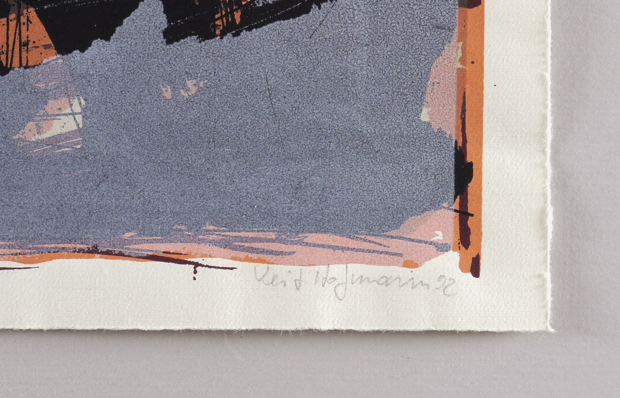 1992. Farbsiebdruck / Farbserigrafie, in 5 Farben, auf rauem hellchamois Hahnemühle. – Originale Künstlergrafik, von Veit Hofmann. – Auflage Exemplar Nr. 5/13. – 52,5 x 66,0 cm (Darstellung / Druckbild), 56 x 69 cm (Blatt).