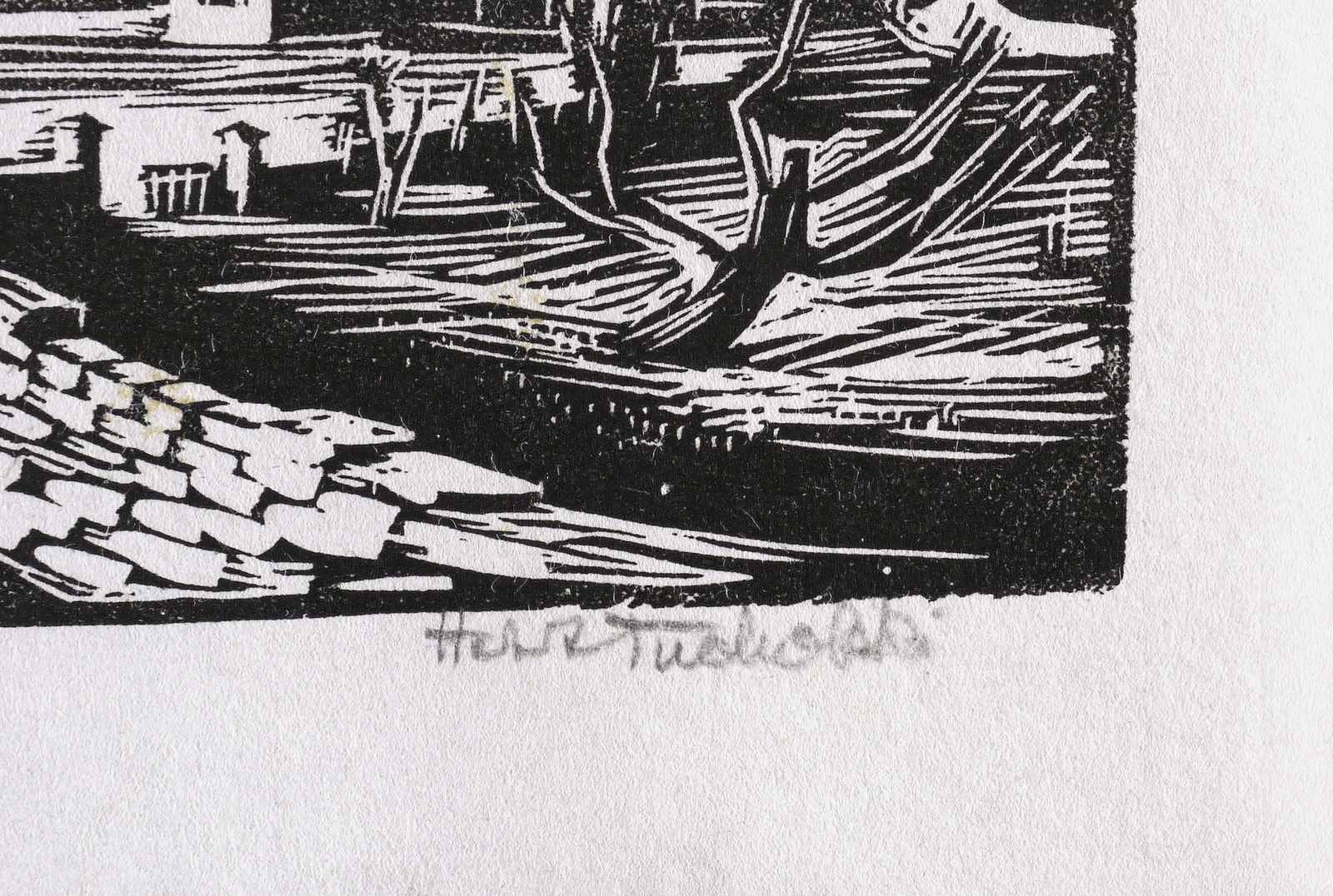 1948. Holzschnitt, in Schwarz, auf rauem hellchamois Simili-Japan. – Originale Künstlergrafik, von Herbert Tucholski. – 12,7 x 25,8 cm (Darstellung / Druckstock), 16 x 29 cm (Blatt).