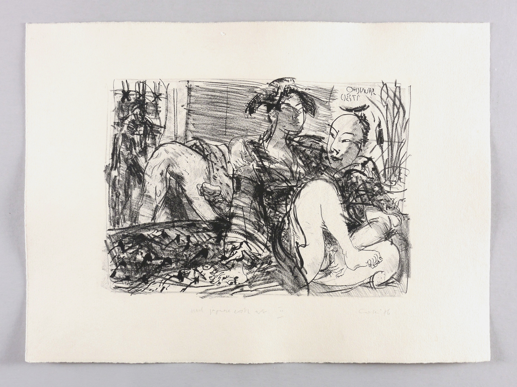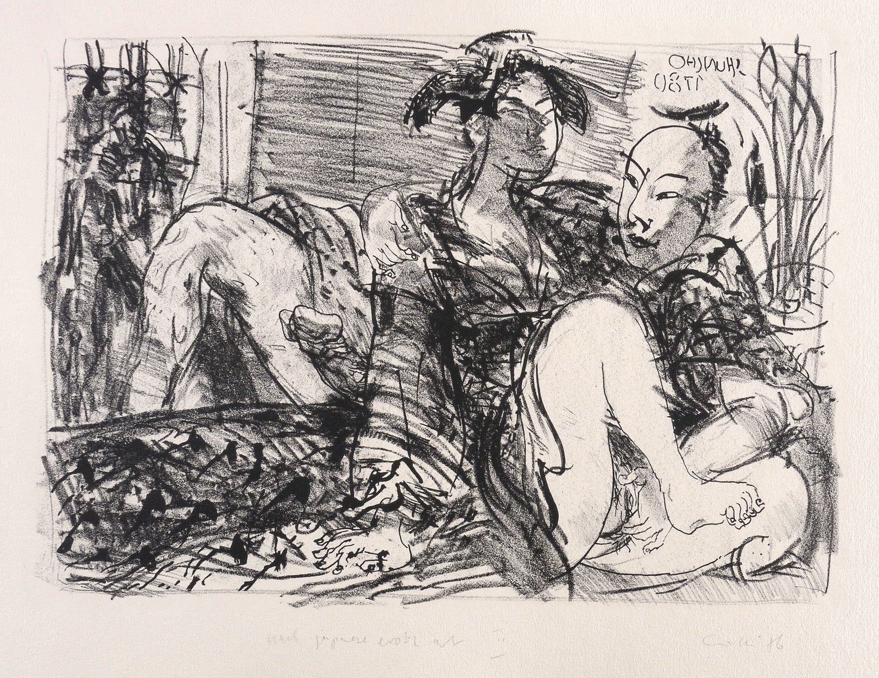 Rechts unten in Bleistift signiert und datiert: ″Gille 86″. Links Titel: ″Nach japanese erotic art II″. Im Stein rechts oben spiegelverjehrte Inschrift: ″SHUNSHO 1780″. – Sehr guter Zustand.