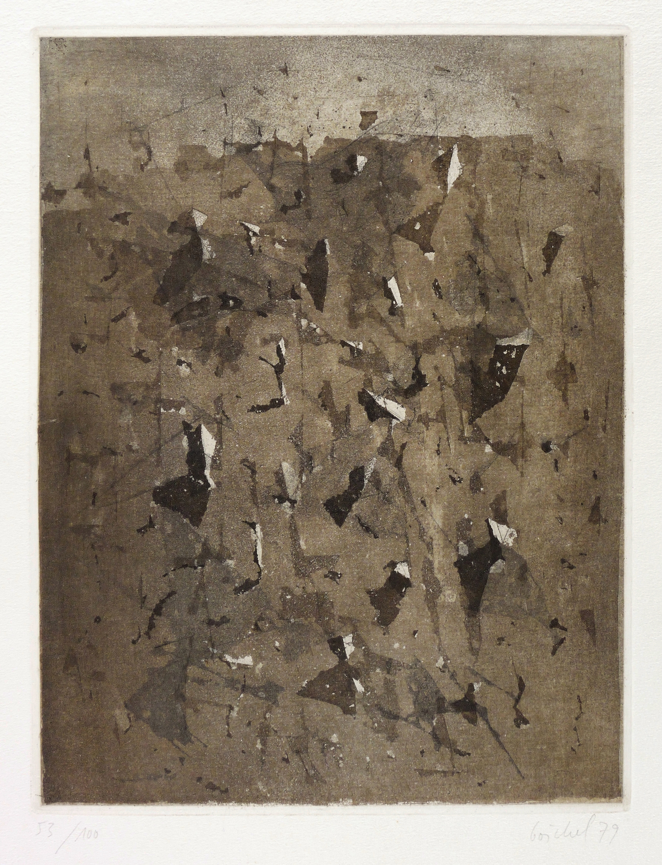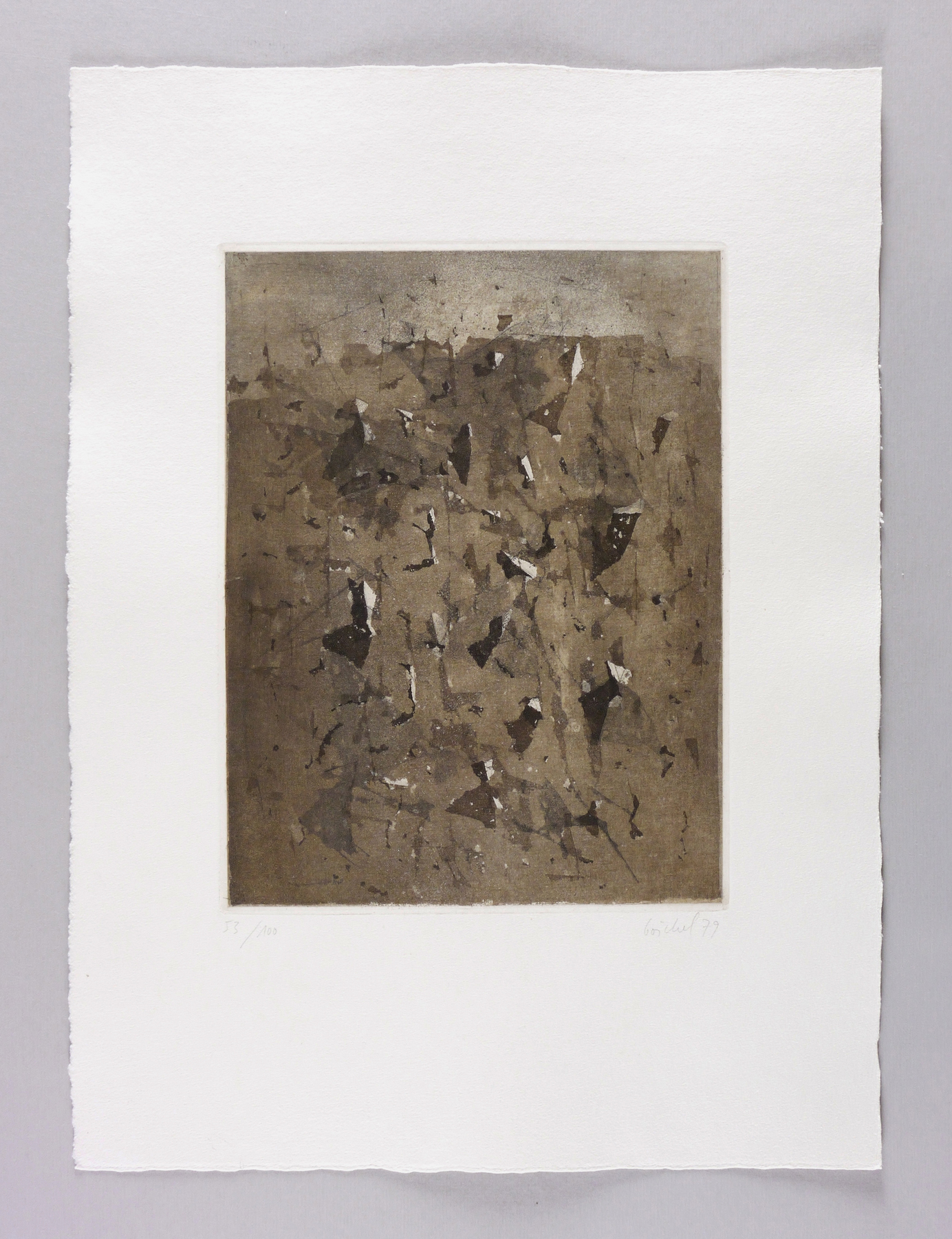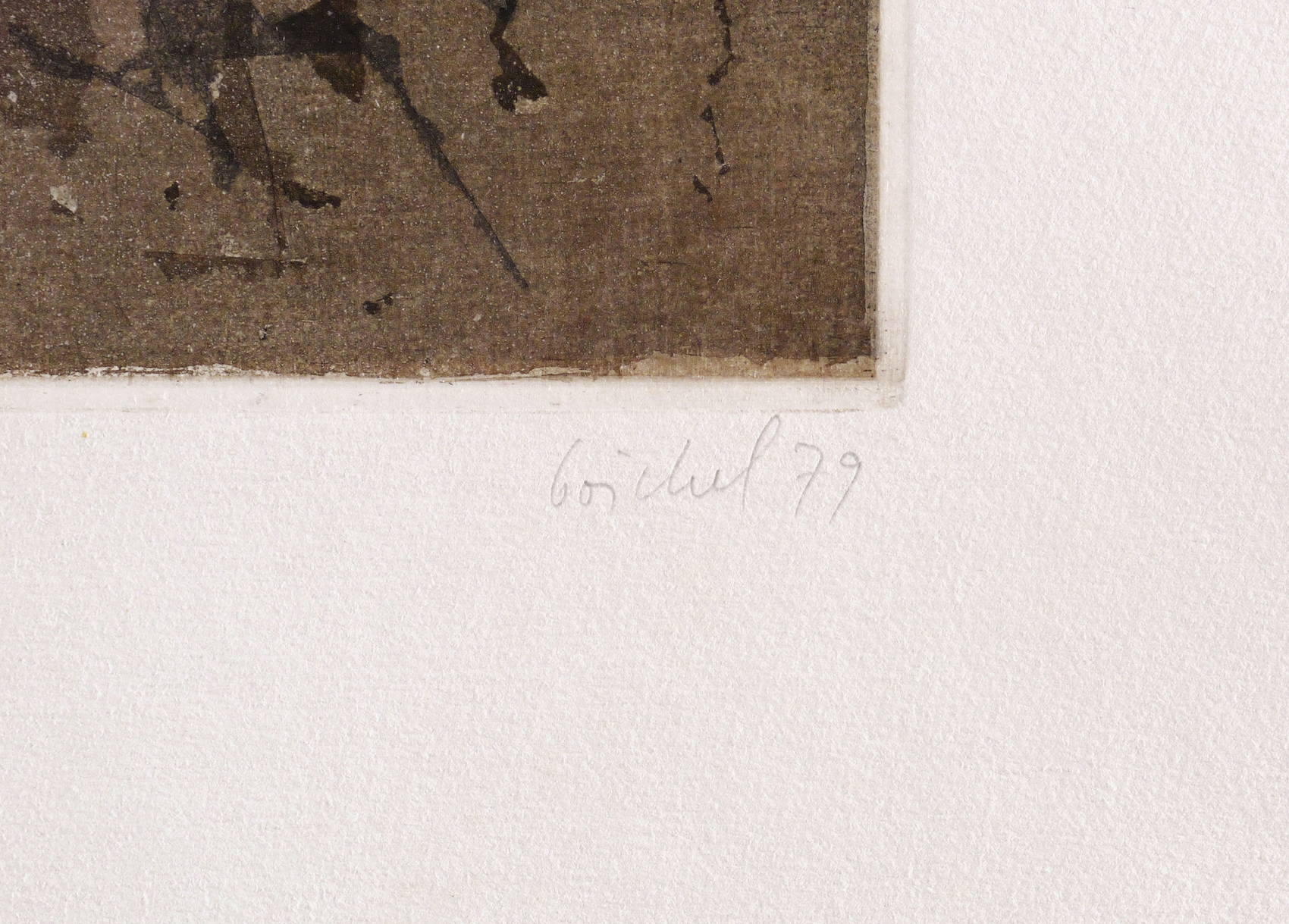 1979. Farbradierung / Aquatinta, in Braun, Beige & Schwarzbraun, auf hellchamois Velinkarton. – Originale Künstlergrafik, von Eberhard Göschel. – Auflage Exemplar Nr. 53/100. – 32,4 x 24,7 cm (Darstellung / Platte), 54 x 40 cm (Blatt).