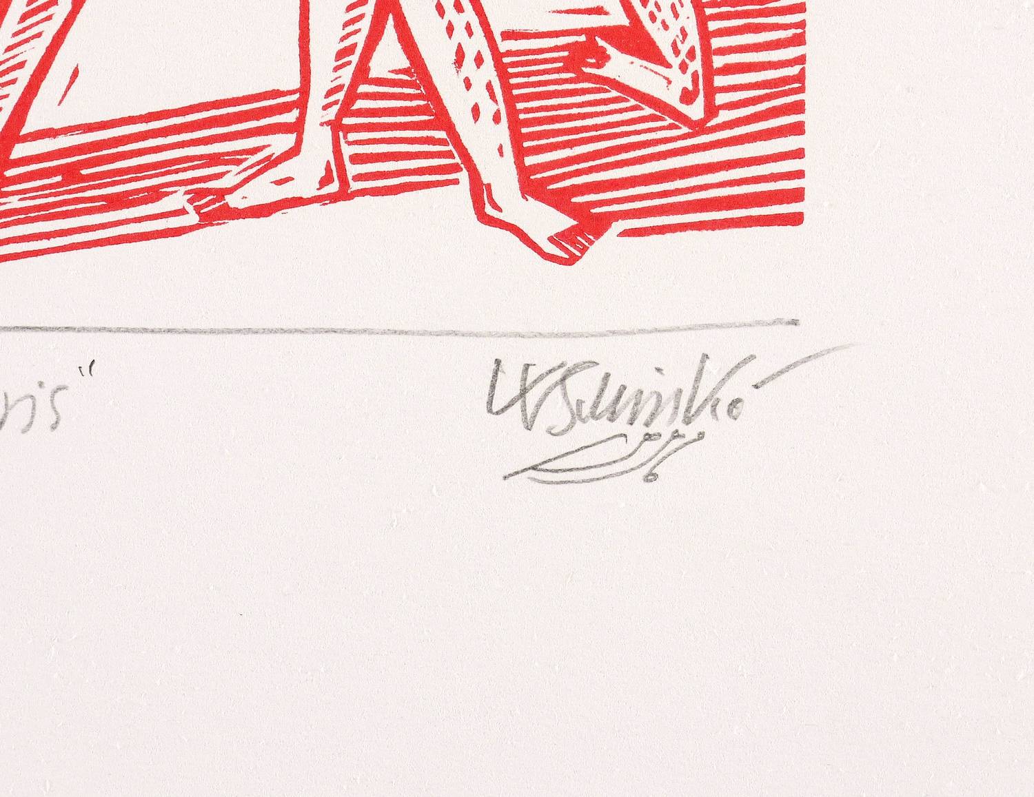 1996. Farbholzschnitt, in Hellrot, auf leichtem hellchamois Velin. – Originale Künstlergrafik, von Werner Schinko. – 10,3 x 9,5 cm (Darstellung / Druckbild), 18 x 14 cm (Blatt).