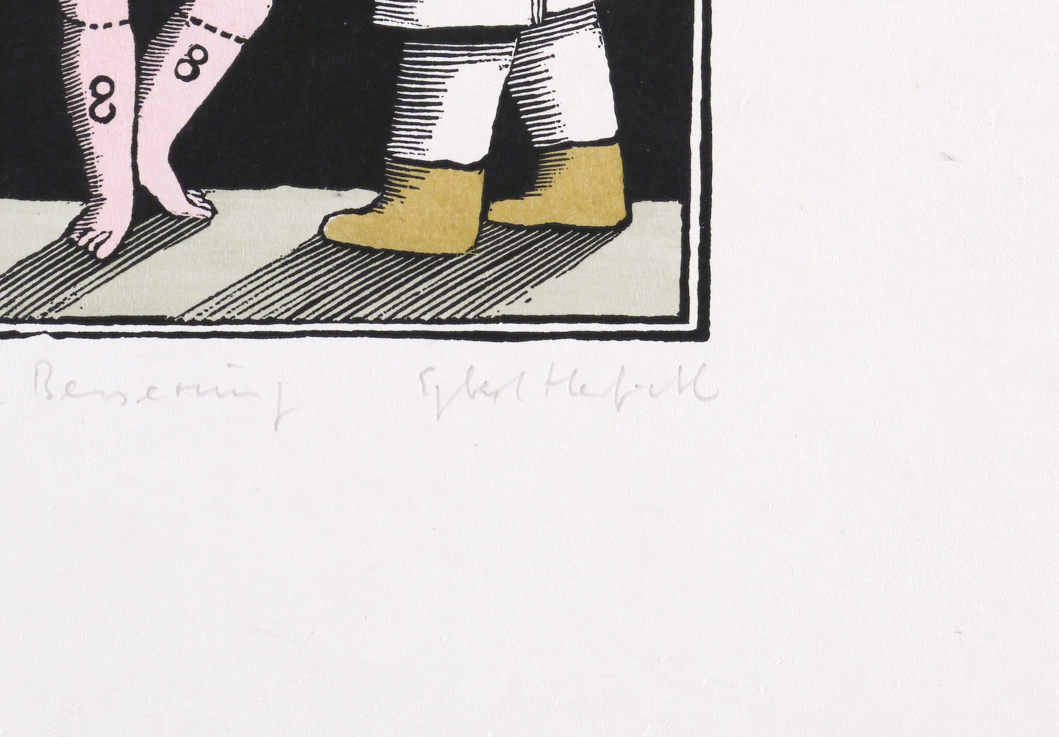1970-1975. Farbholzschnitt, in 6 Farben, auf hellem Karton. – Originale Künstlergrafik, von Egbert Herfurth. – 9,6 x 6,5 cm (Darstellung / Druckbild), 21 x 15 cm (Blatt).