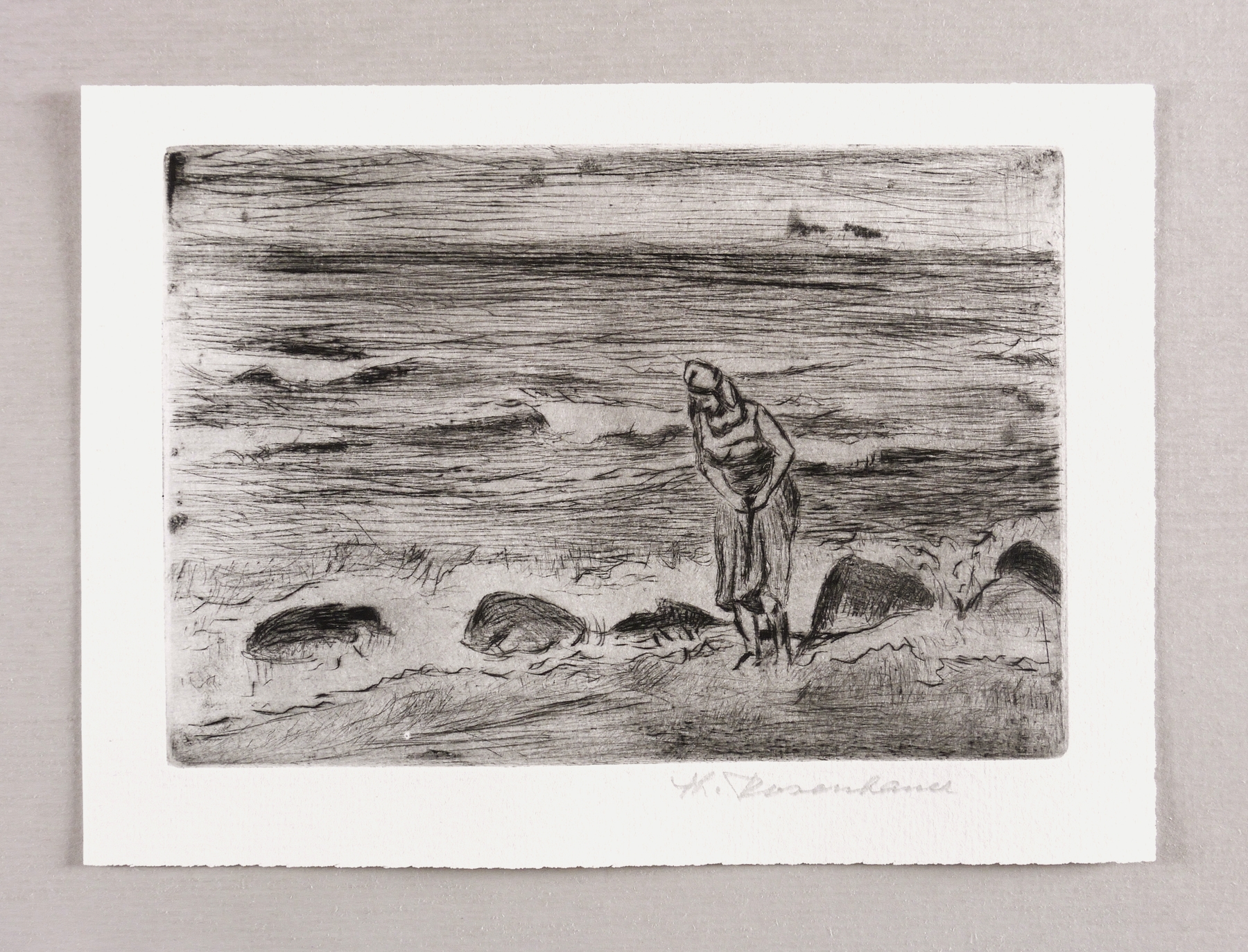 Rechts unten in Bleistift signiert: ″Th. Rosenhauer″. – Motivgleich mit dem Ölgemälde ″Frau am Strand″ von 1963 (Werkverzeichnis Gabriele Werner Nr. 293), hier jedoch spiegelverkehrt dazu. – Originalrandiges Exemplar. Sehr guter Zustand.
