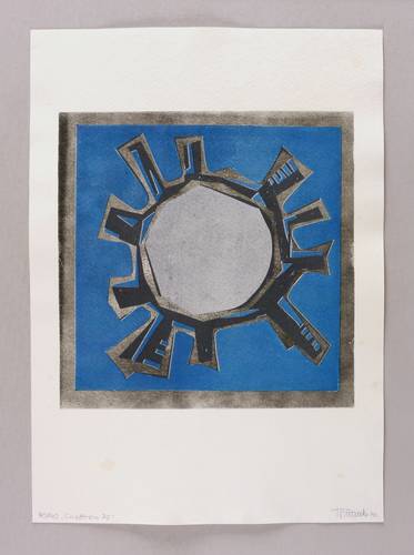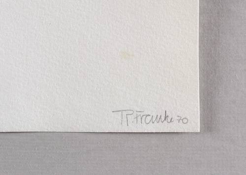 Aus: Jahresgabe der Erfurter Ateliergemeinschaft 1970. Chiffren (Erfurt: Erfurter Ateliergemeinschaft 1970). – Am Blattrand rechts unten in Bleistift signiert und datiert: ″R. Franke 70″. Links Auflagenbezeichnung und Titel: ″40/40 'Chiffren 70'″. – Im Rand kaum merklich fleckig. Sonst tadellos. Insgesamt noch guter Zustand.