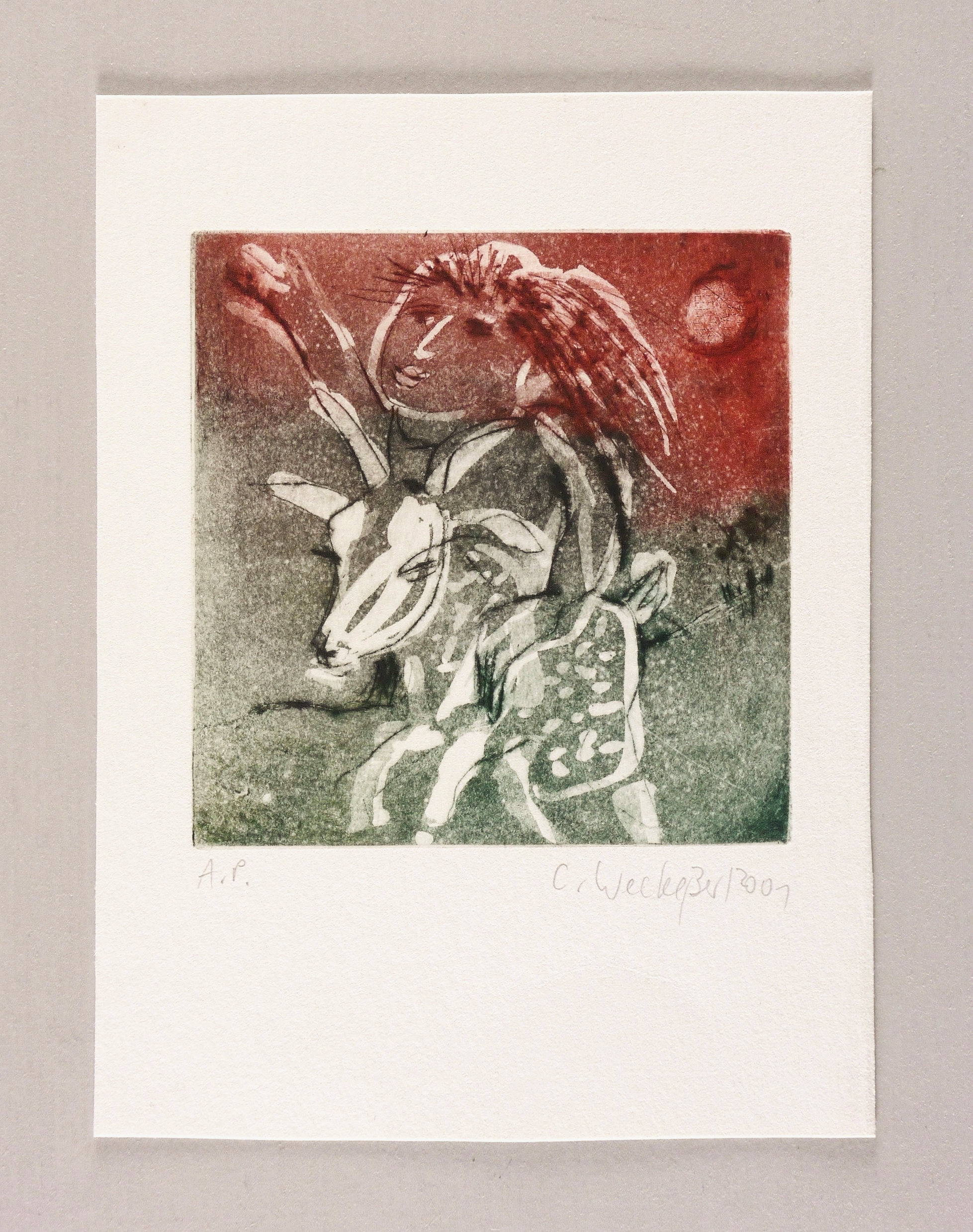 2001. Farbradierung / Aquatinta & Kaltnadel, in Moosgrün & Rostrot, auf hellchamois Velinkarton. – Originale Künstlergrafik, von Carla Weckeßer. – Künstlerexemplar (e.a.). – 10,0 x 9,8 cm (Darstellung / Platte), 17 x 13 cm (Blatt).