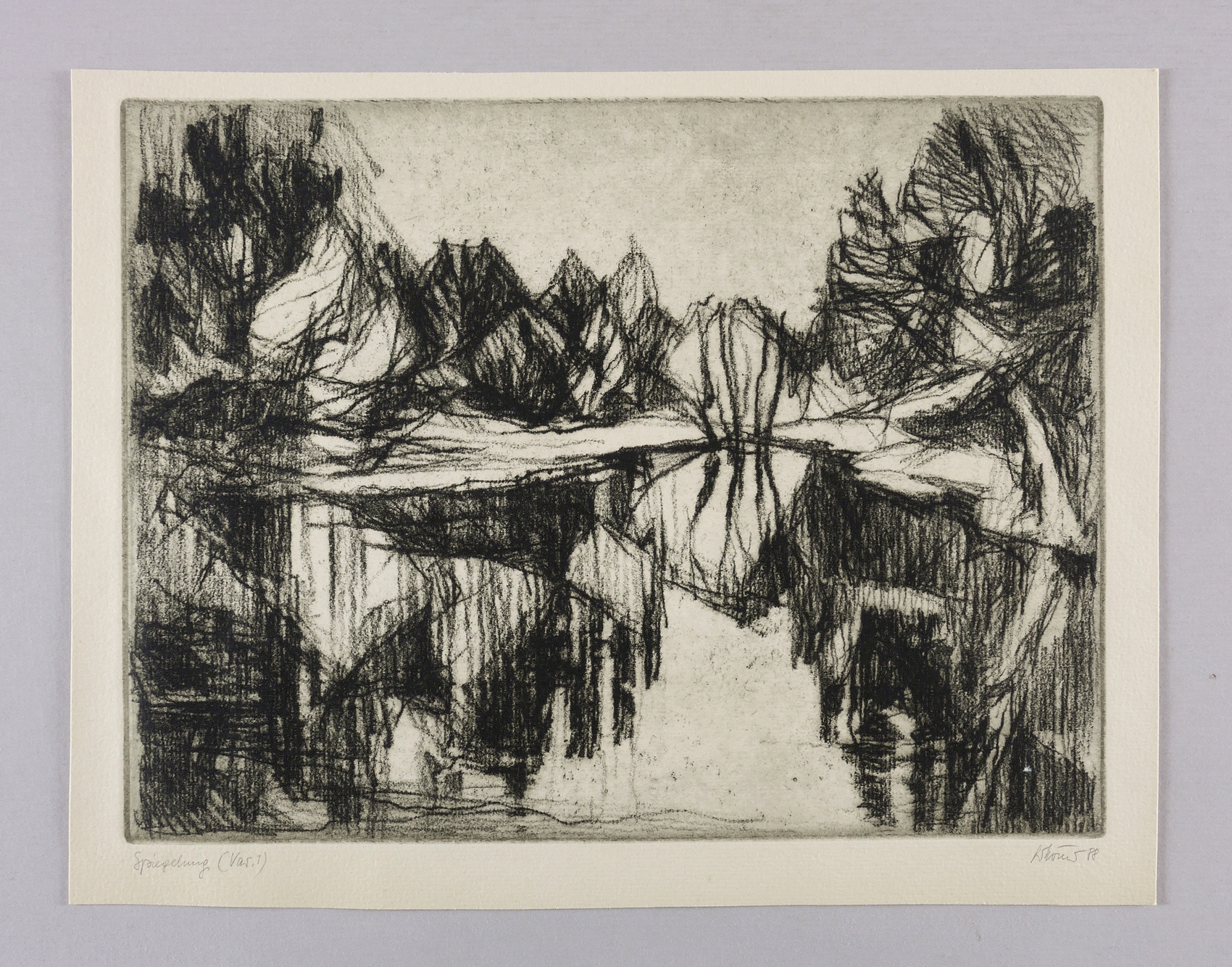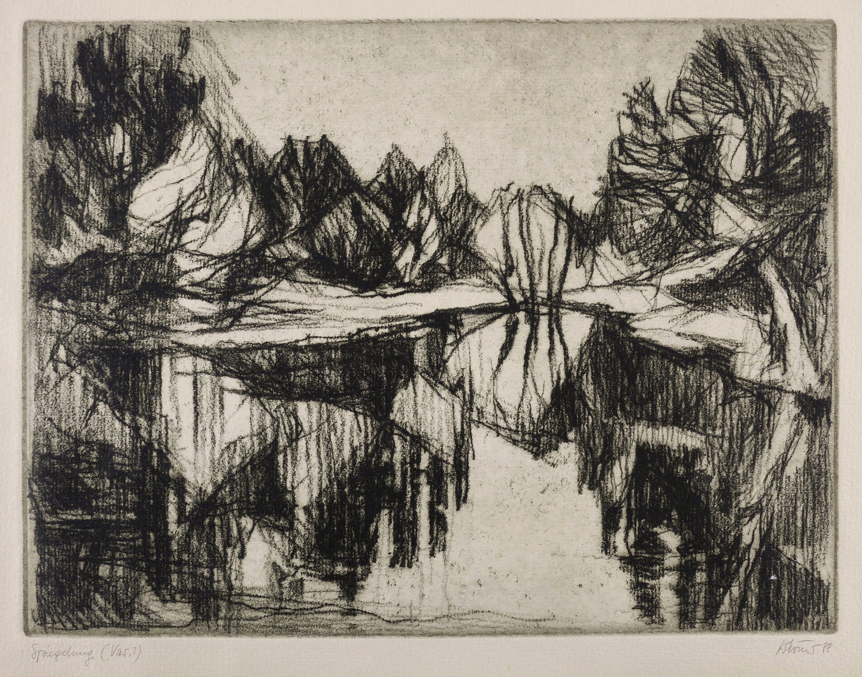 Rechts unten in Bleistift signiert und datiert: ″G. Körner 88″. Links Titel und Auflagenbezeichnung: ″Spiegelung (Var. 1)″. – Papier stärker gegilbt. Immer noch sehr guter Zustand.