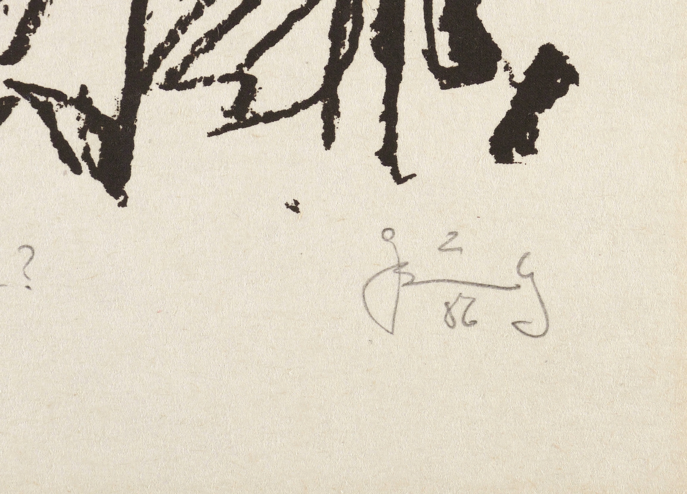 1986. Lithografie / Kreidelithografie, in Schwarz, auf hartem hellchamois Velin. – Originale Künstlergrafik, von Gottfried Bräunling. – 21,6 x 11,0 cm (Darstellung / Druckbild), 27 x 14 cm (Blatt).