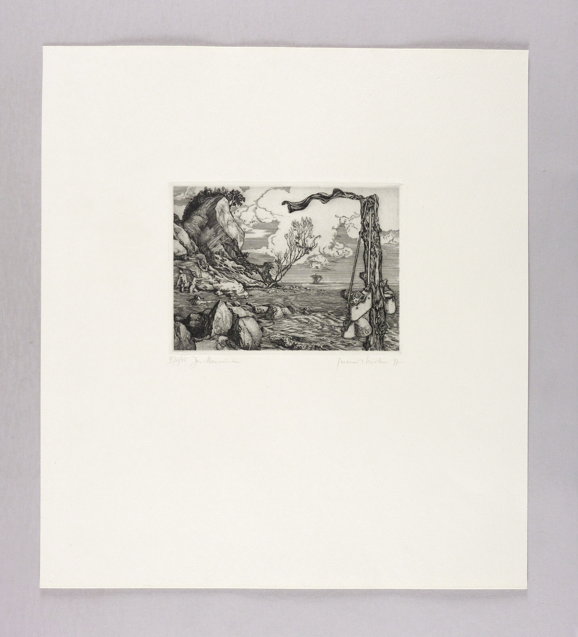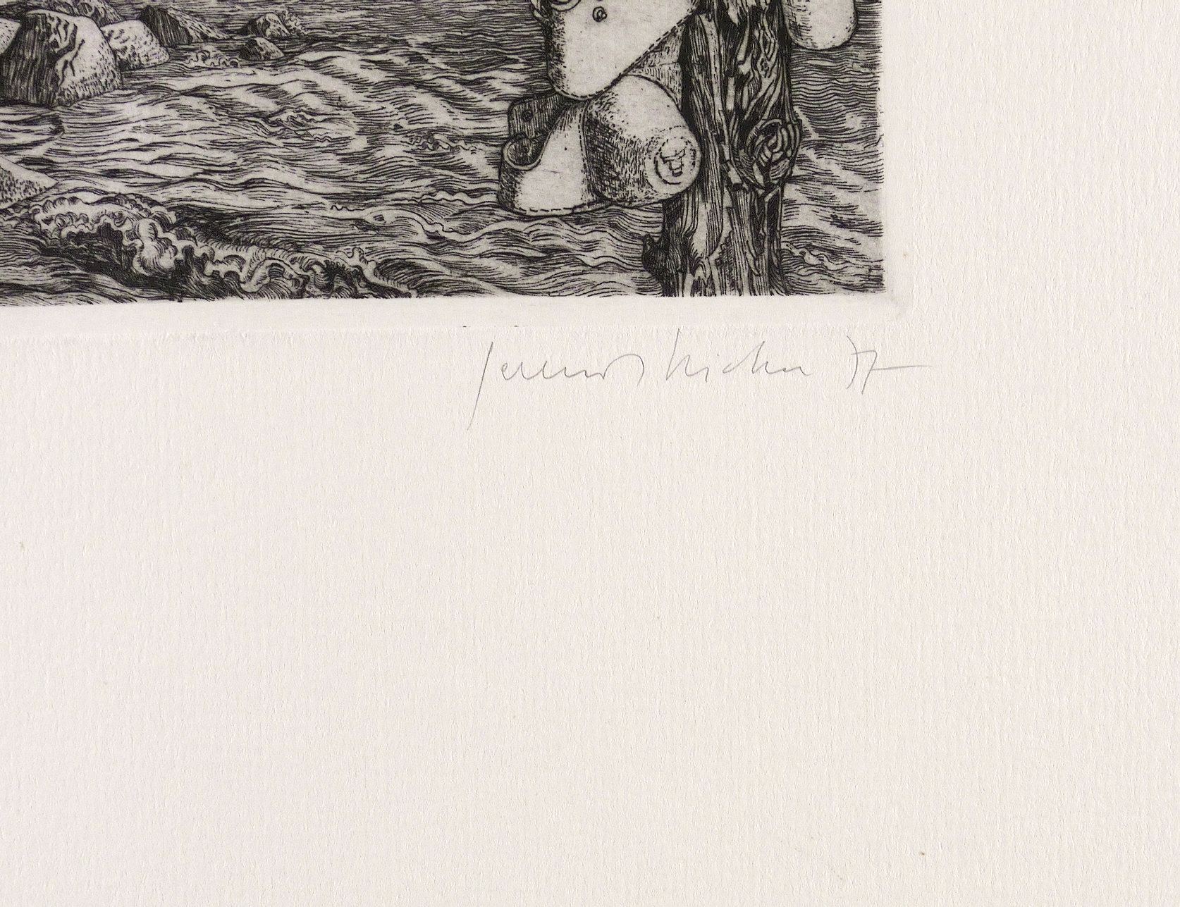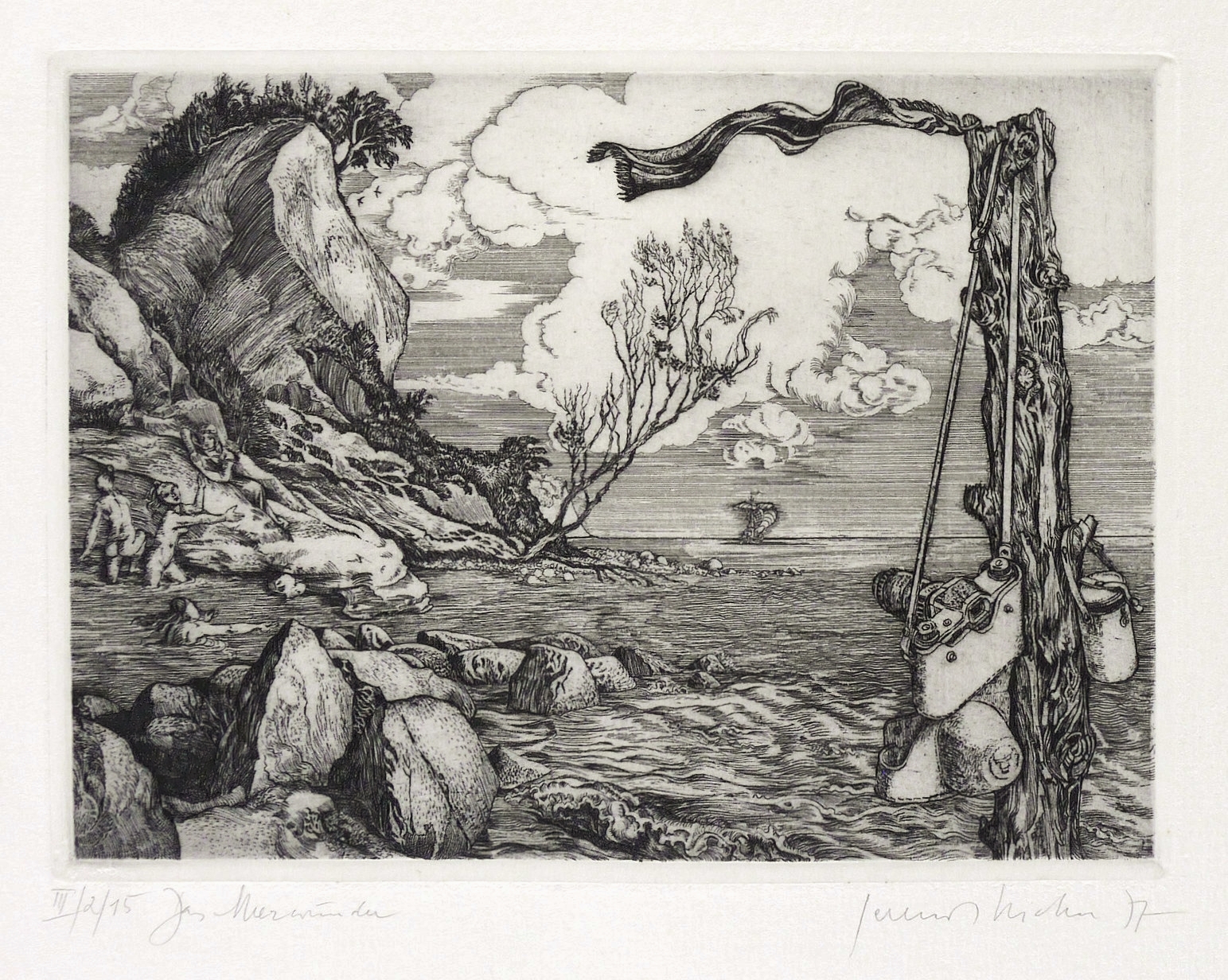 WVZ II-77. – Rechts unten in Bleistift signiert und datiert: ″Gerenot Richter 77″. Links Auflagenbezeichnung: ″II/2/15″. Dazu Titel: ″Das Meerwunder″. – Radierung als Hommage zu Dürers 450. Todestag. – Ohne Mängel. Sehr guter Zustand.