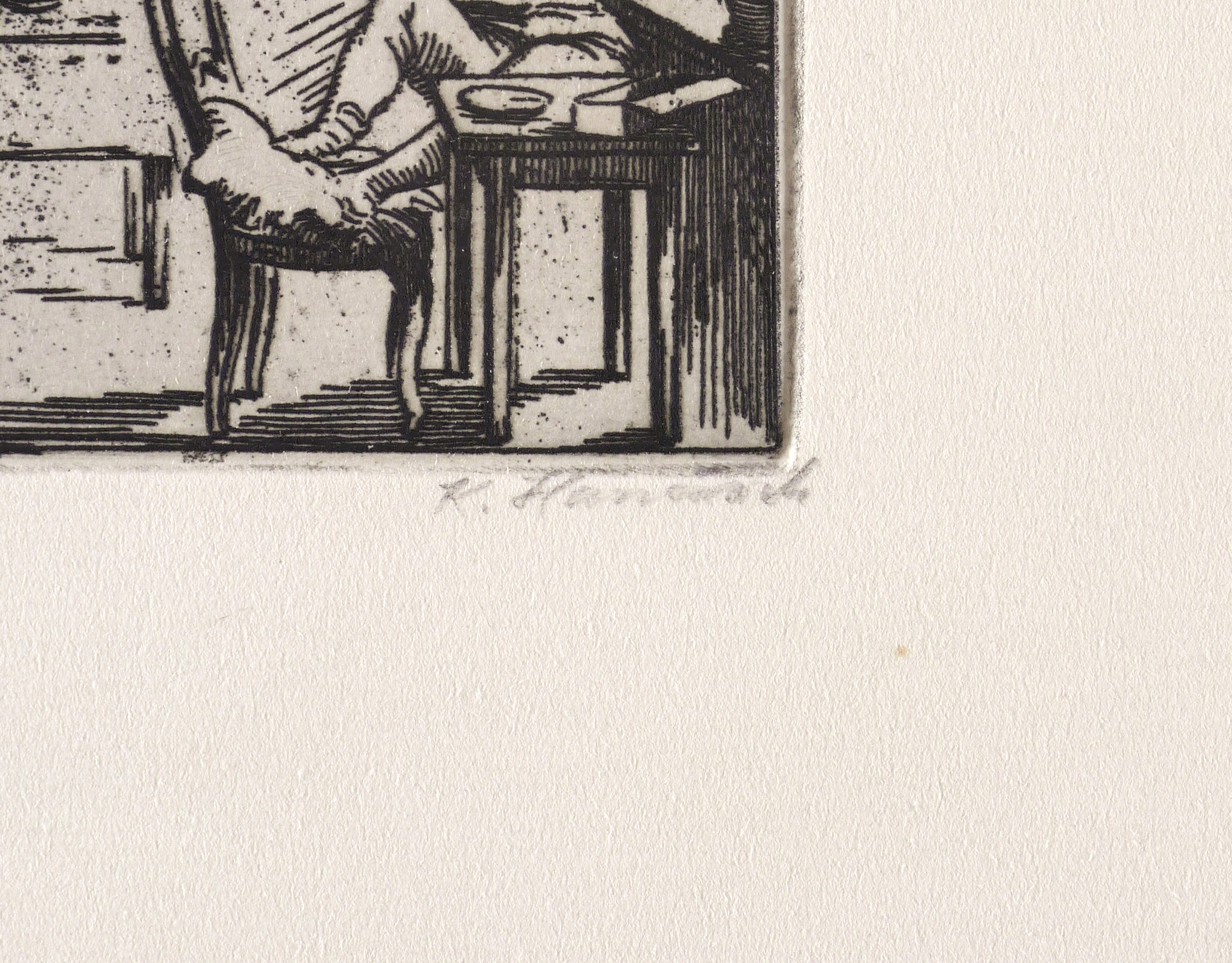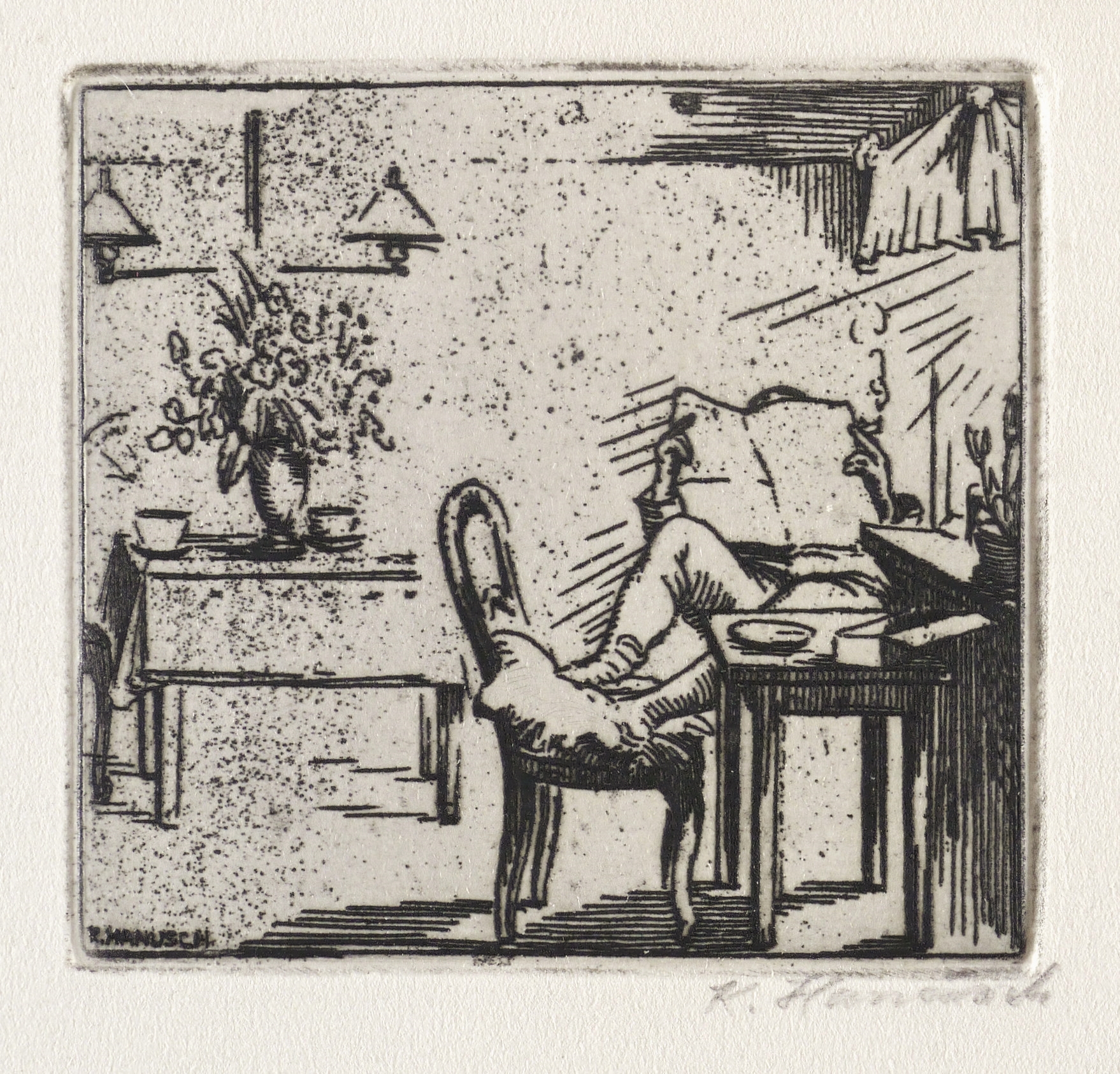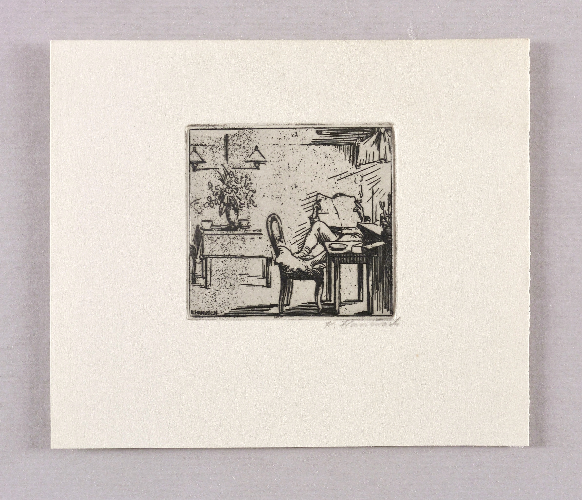 1964. Radierung / Strichätzung, in Schwarz, auf hellgelbem Maschinenbütten. – Originale Künstlergrafik, von Karl Hanusch. – 6,2 x 6,7 cm (Darstellung / Platte), 13 x 15 cm (Blatt).