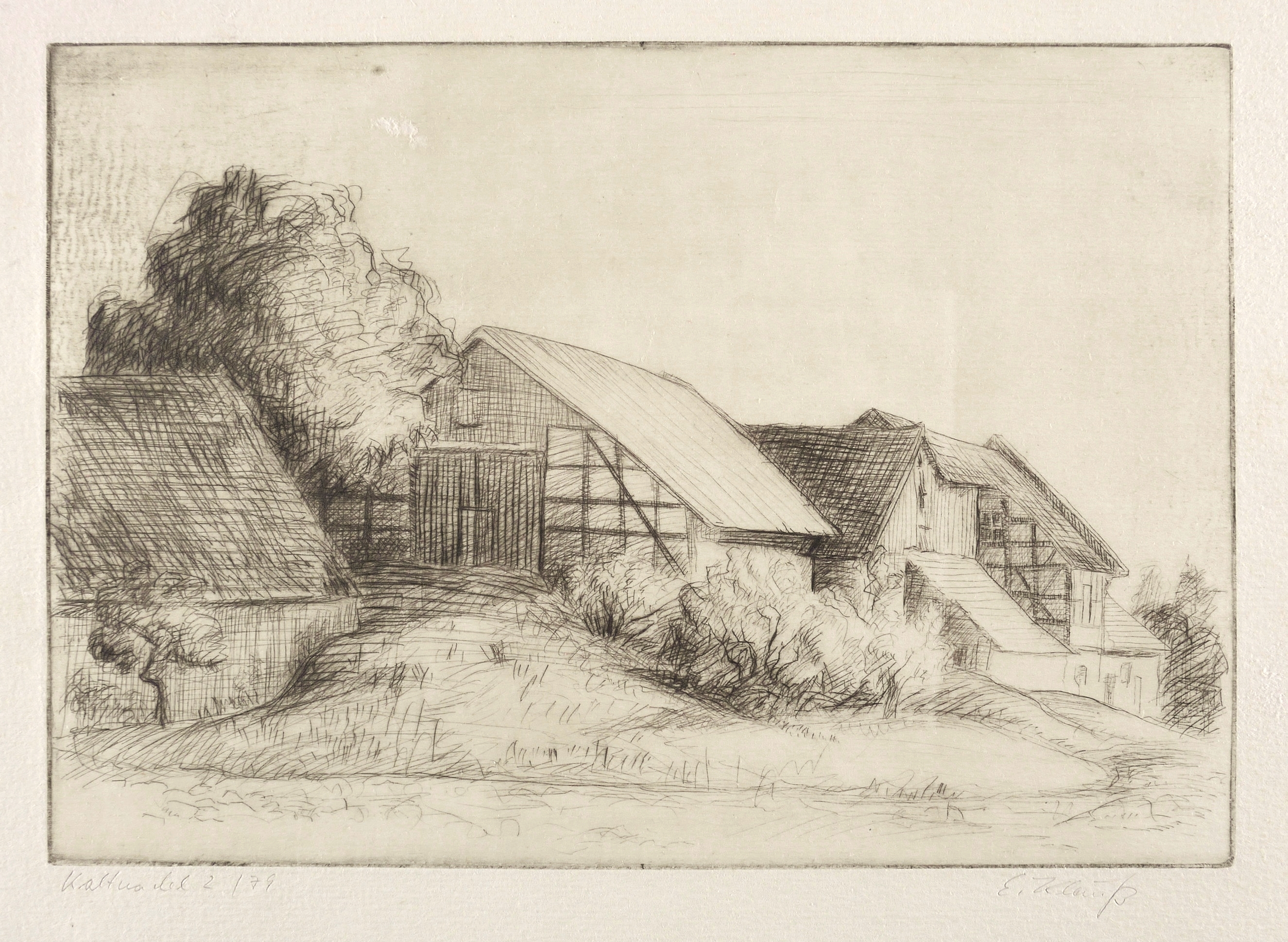 1979. Radierung / Kaltnadel, in Schwarz, auf hartem hellchamois Weißenborn. – Originale Künstlergrafik, von Eberhard Klauß. – 16,1 x 23,1 cm (Darstellung / Platte), 21 x 29 cm (Blatt).