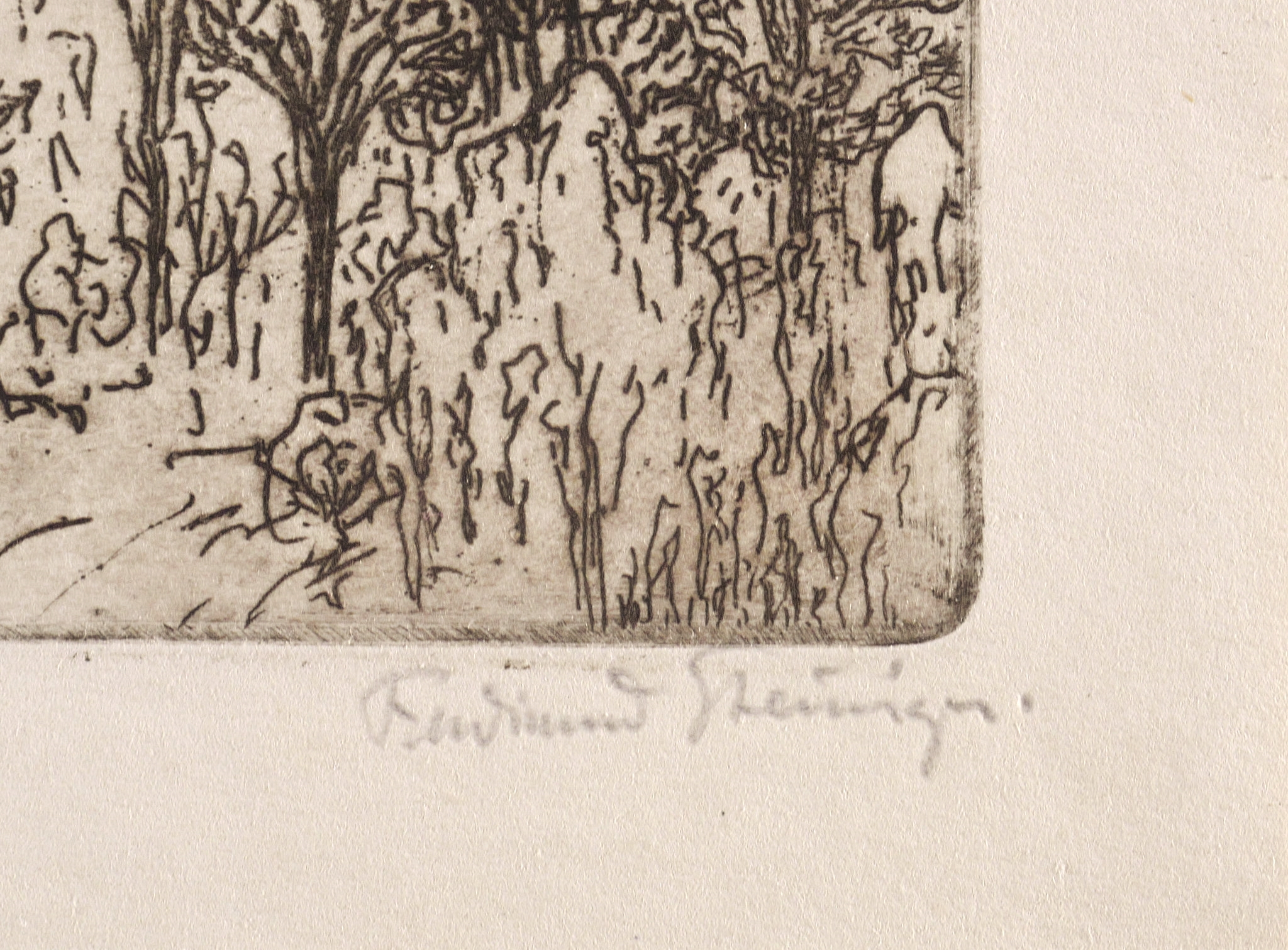 1912. Radierung / Strichätzung, in Schwarzbraun, auf rauem gelbem Velin. – Originale Künstlergrafik, von Ferdinand Steiniger. – 30,4 x 40,6 cm (Darstellung / Platte), 35 x 45 cm (Blatt).