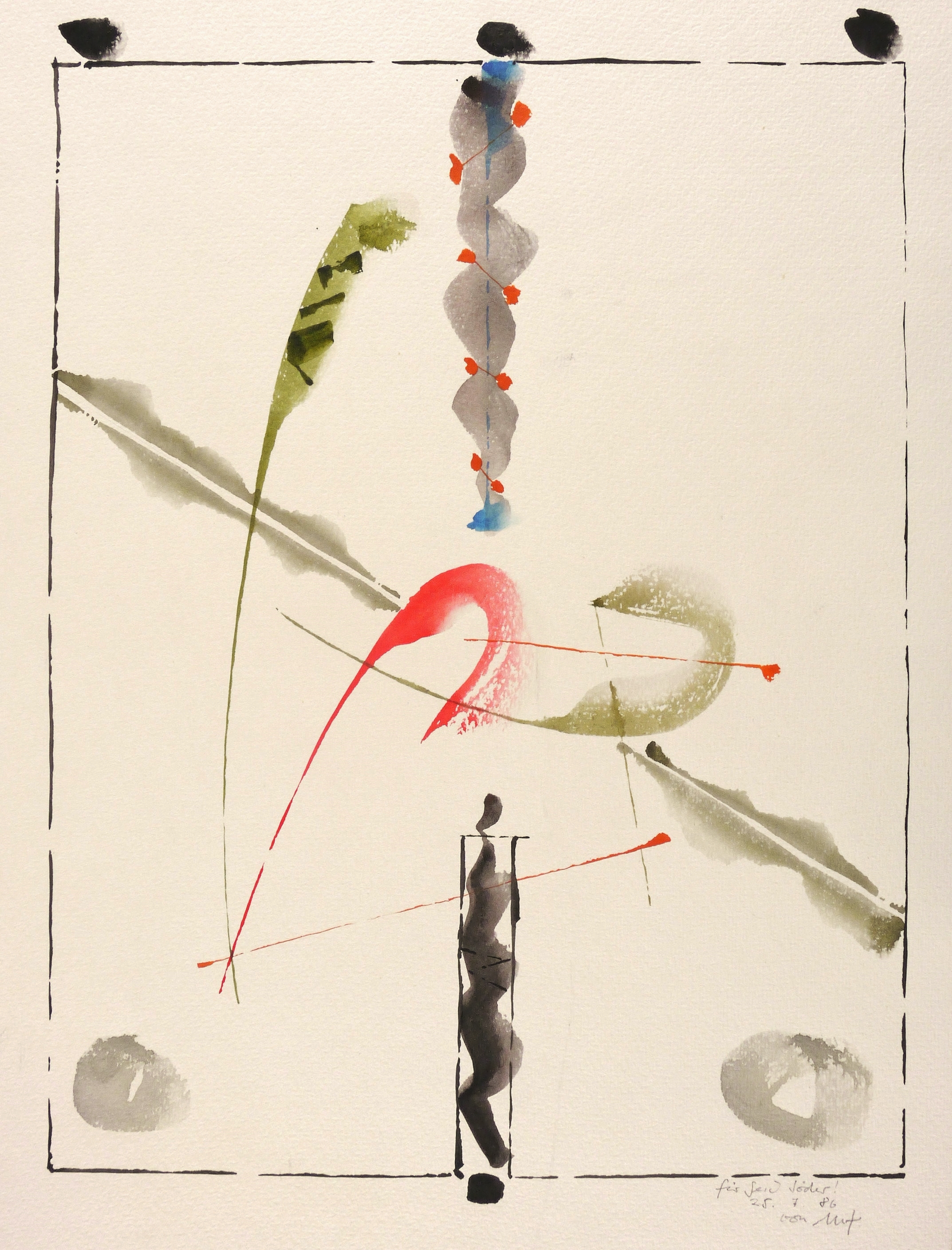 1986. Aquarell, auf festem gelbem Aquarellkarton. – Originale Künstlergrafik, von Deutsch (20. Jh.). – Unikat. – 48,0 x 36,2 cm (Darstellung / Blatt).