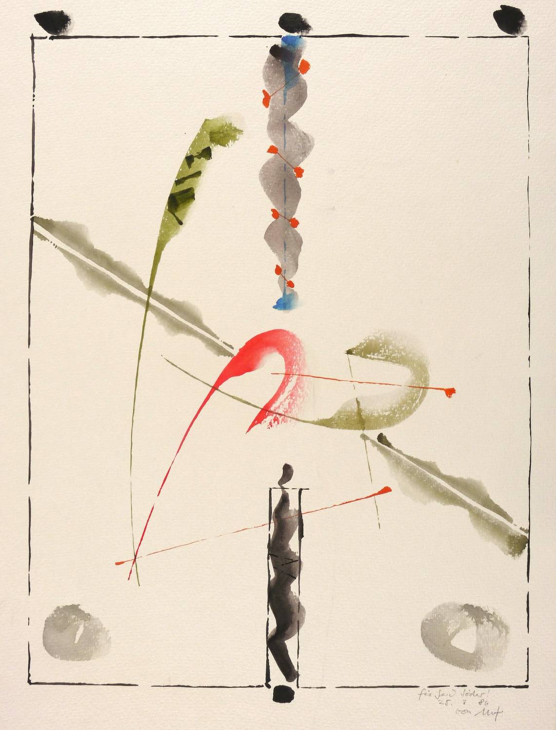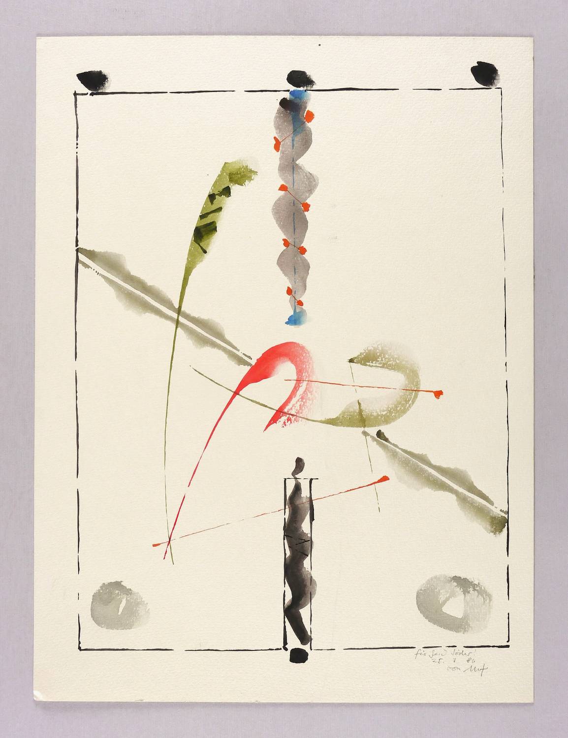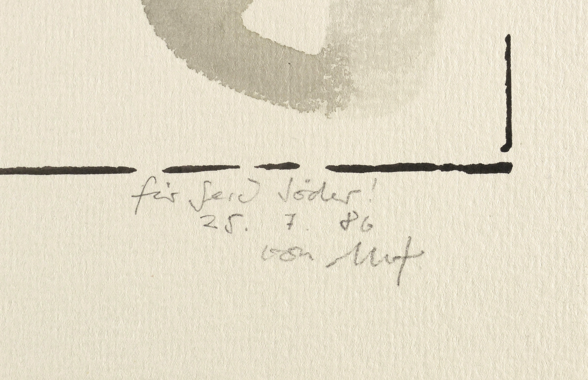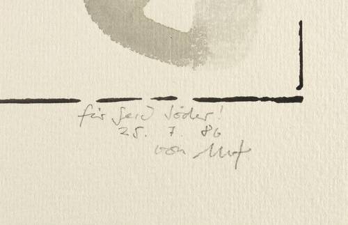 Links unten signiert und datiert: ″25.7.86 von mf″. Dazu Widmung. – Provenienz: Sammlung Gerlint und Gert Söder, Dresden. – Sehr guter Zustand.