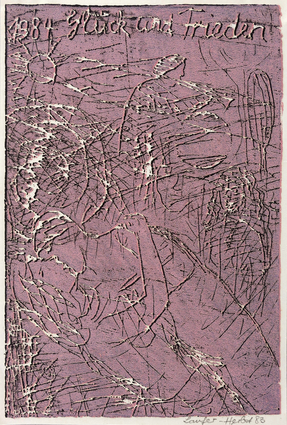 1983. Farblinolschnitt, in Violett & Schwarz, auf hellchamois Velin. – Originale Künstlergrafik, von Maria Laufer-Herbst. – 21,4 x 14,4 cm (Darstellung / Druckbild), 22,1 x 15,0 cm (Blatt).