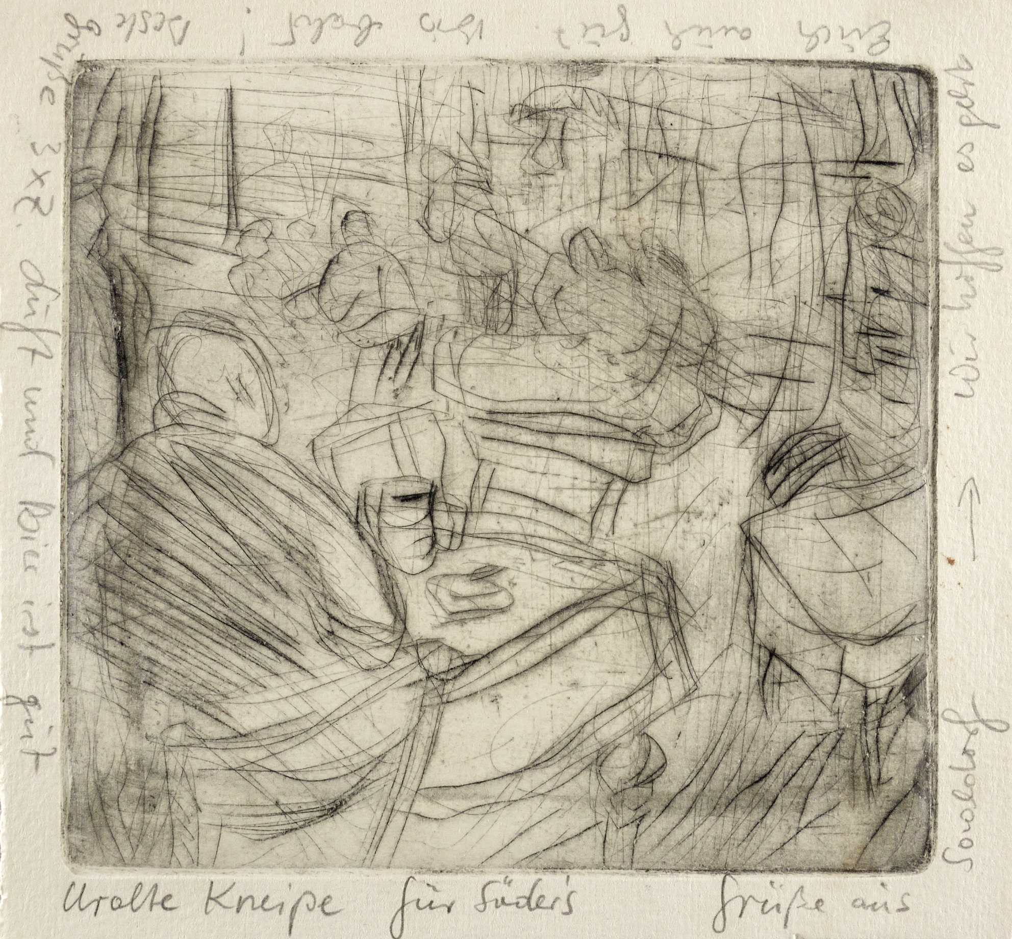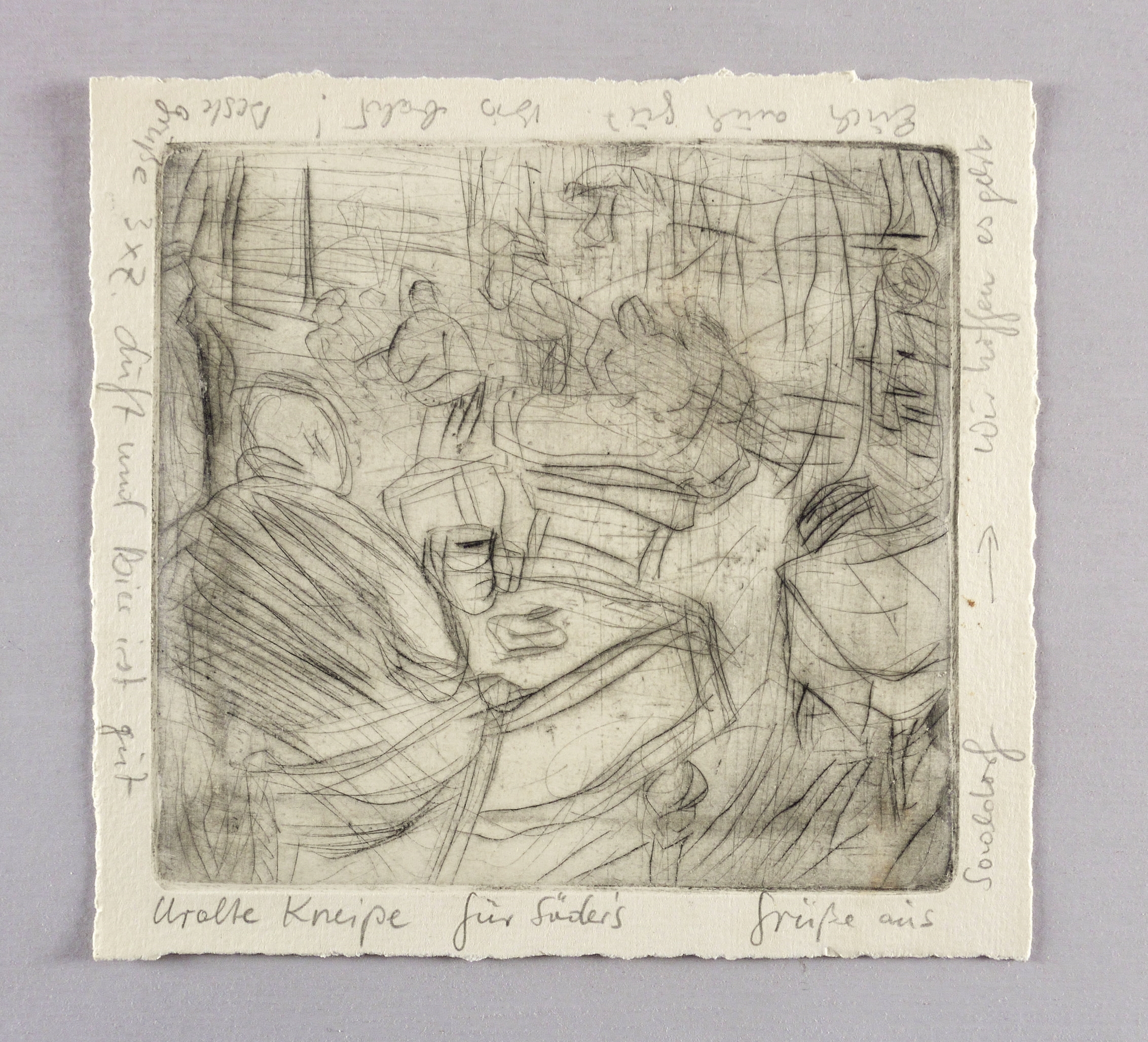 In Bleistift betitelt und bezeichnet: ″Uralte Kneipe // für Söders // Grüße aus Saaldorf // (..)″. – Vermutlich Gastraum im Landgasthof Mayrwirt in Saaldorf-Surheim im Berchtesgadener Land. – Provenienz: Sammlung Gerlint und Gert Söder, Dresden. – Sehr guter Zustand.