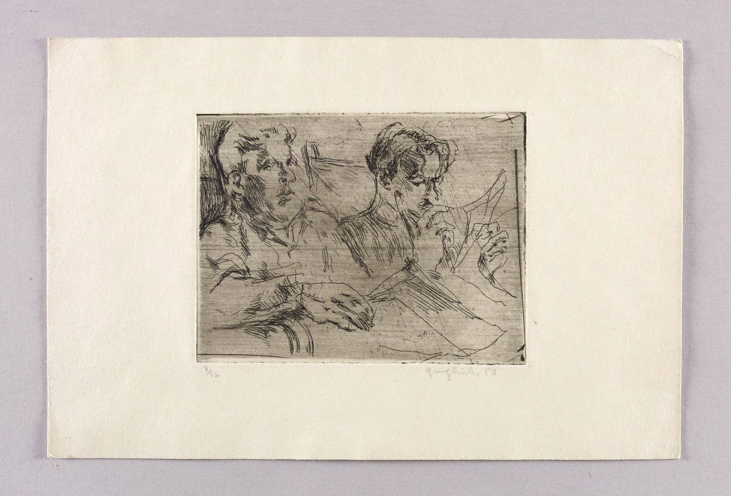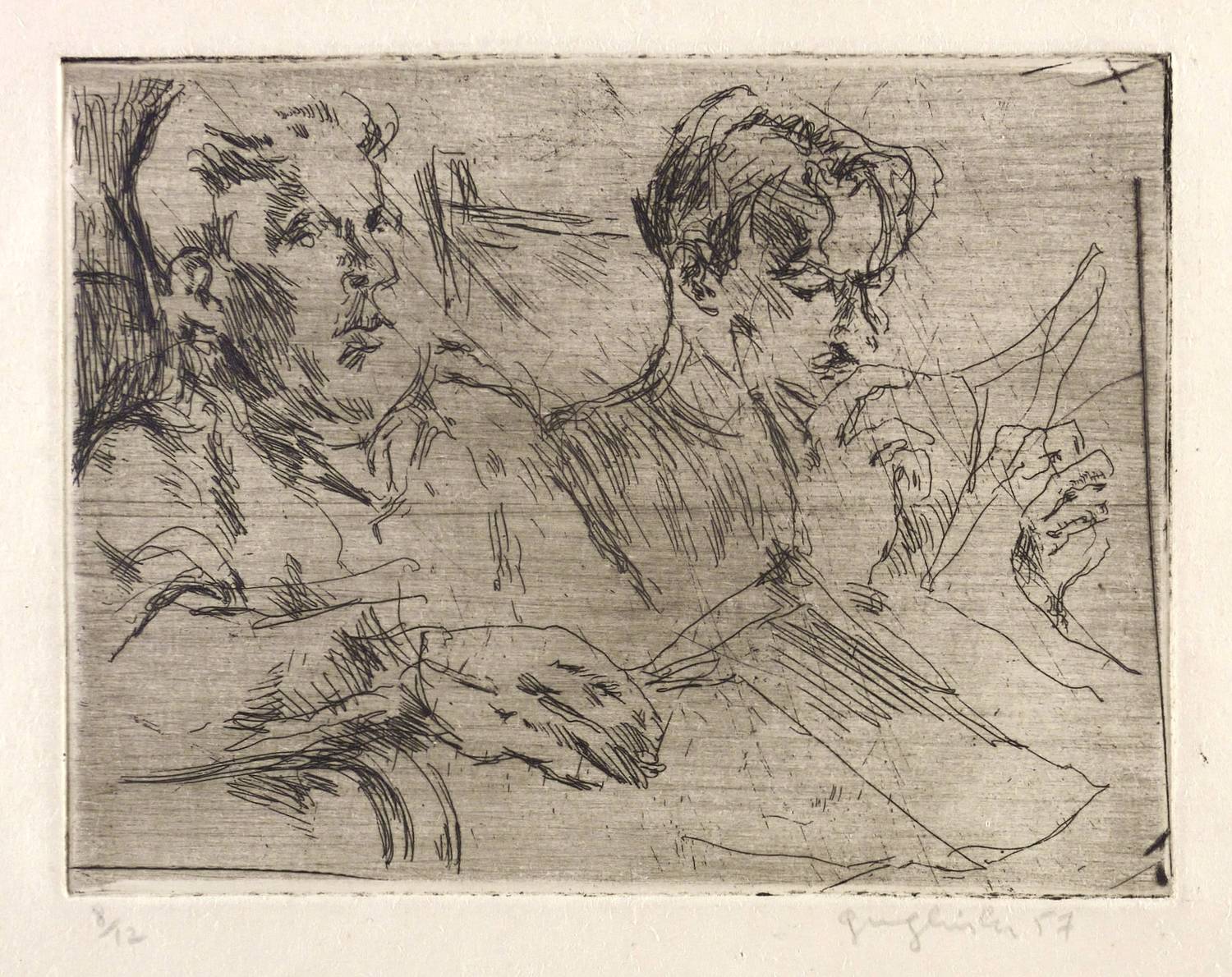1957. Radierung / Kaltnadel, in Schwarz, mit Plattenton, auf chamois Velin. – Originale Künstlergrafik, von Georg Eisler. – Auflage Exemplar Nr. 8/12. – 11,9 x 15,7 cm (Darstellung / Platte), 20 x 30 cm (Blatt).