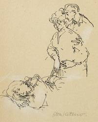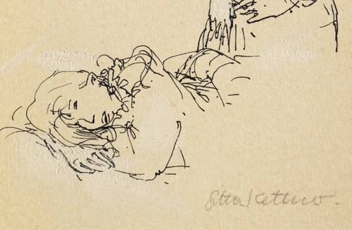 Links unten in Bleistift signiert: ″Gitta Kettner″. – Verso Reste einer Klebemontierung, vorn leicht hell durchschlagend. Im unteren Bereich oberflächlciher Wurmfraß. Mangelhafter Zustand.