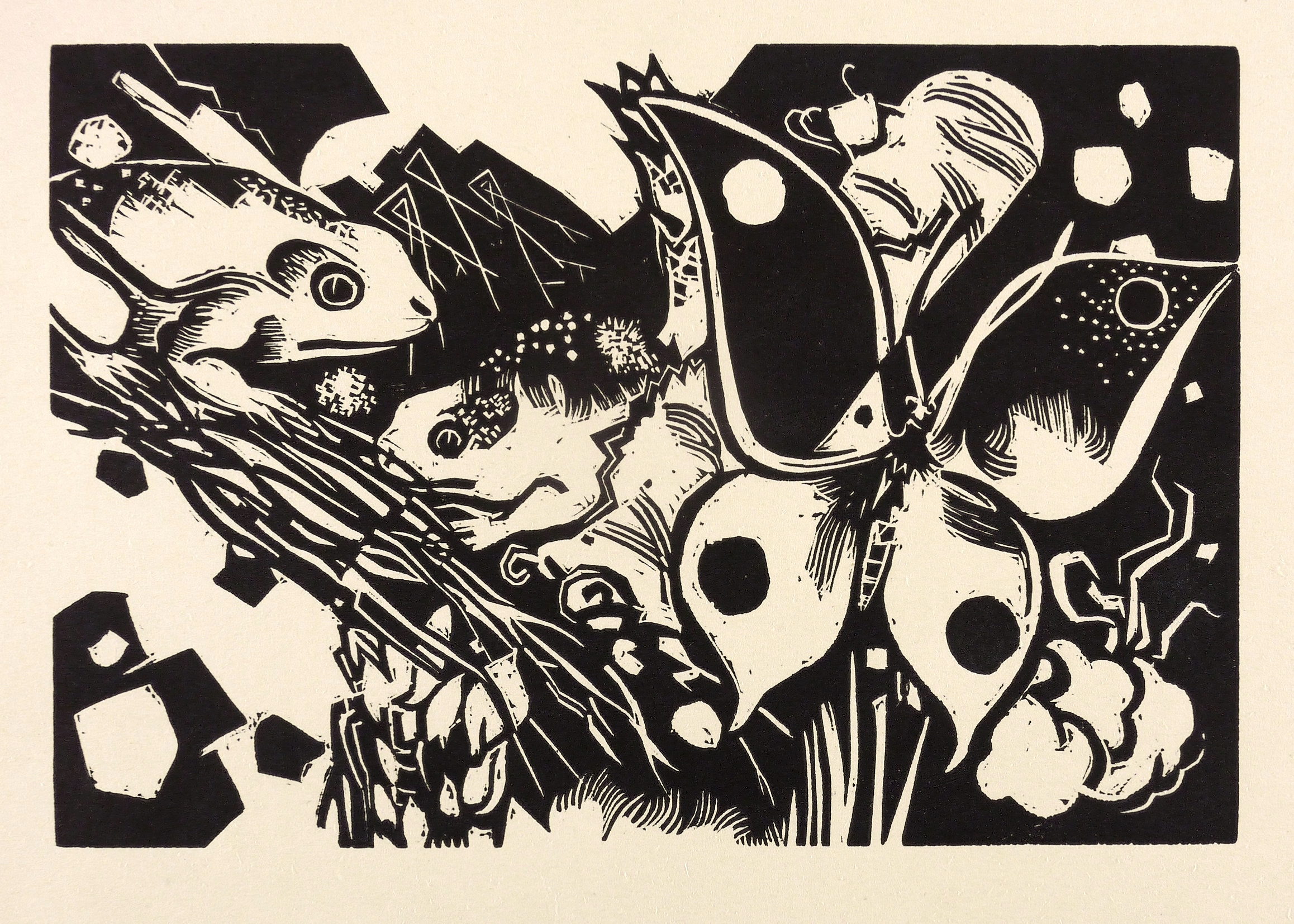 1917. Holzschnitt, in Schwarz, auf gelbem Velinkarton. – Originale Künstlergrafik, von Heinrich Campendonk. – Auflage 110 Exemplare. – 22 x 29 cm (Blatt), 12,1 x 17,9 cm (Darstellung / Druckstock).
