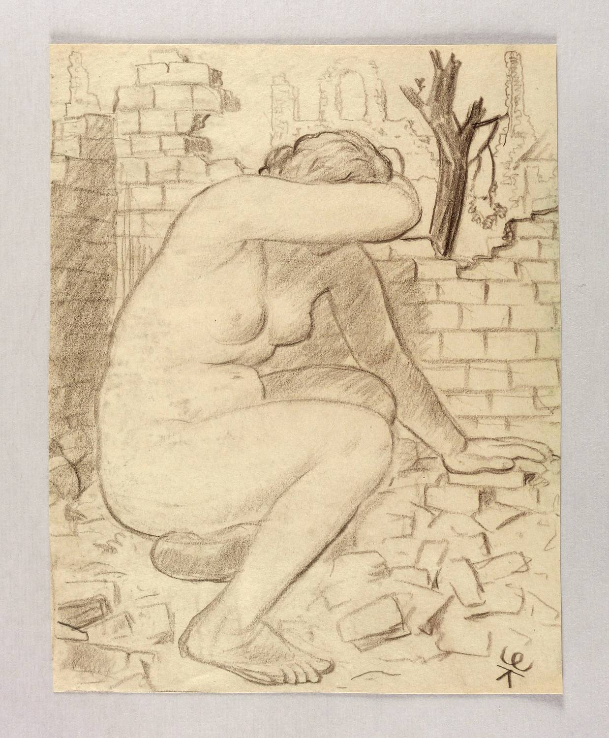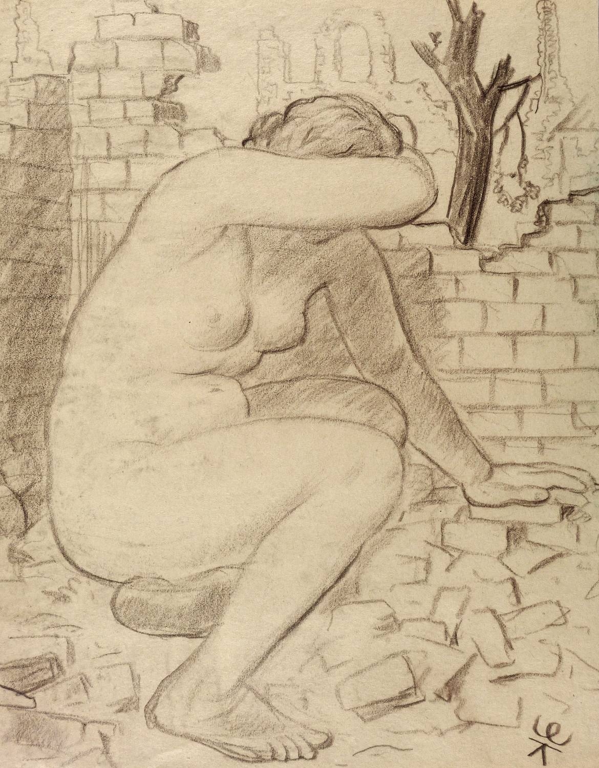 1945-1950. Zeichnung / Kohle, auf leichtem gelbem Velin. – Originale Künstlergrafik, von Karl Enderlein. – Unikat. – 29,2 x 23,1 cm (Darstellung / Blatt).